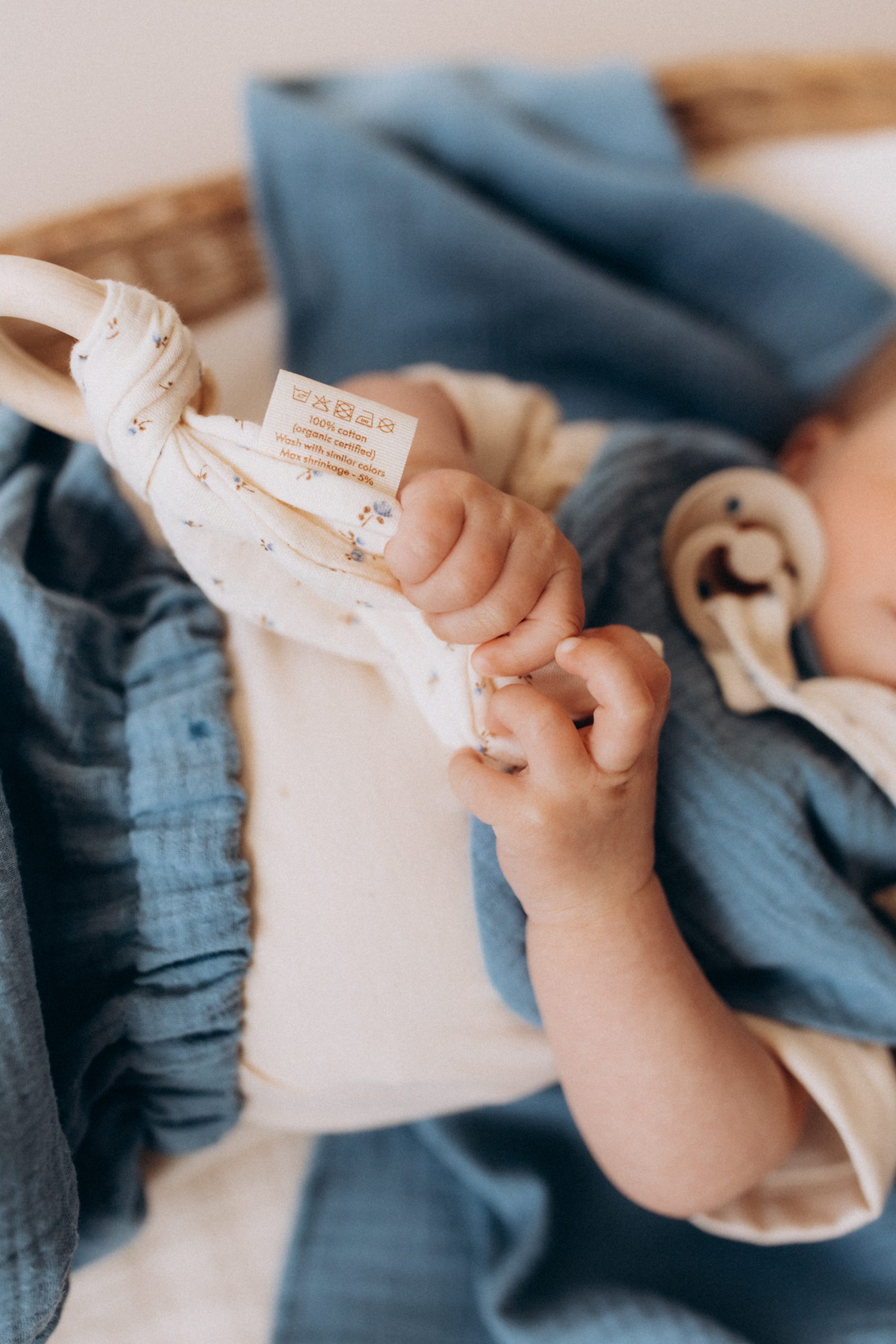 Material: 100% Bio-Baumwolle (GOTS), Knistermaterial: Raschelfolie, Holzring: 6 cm. Mit Liebe in Lettland (EU) hergestellt.