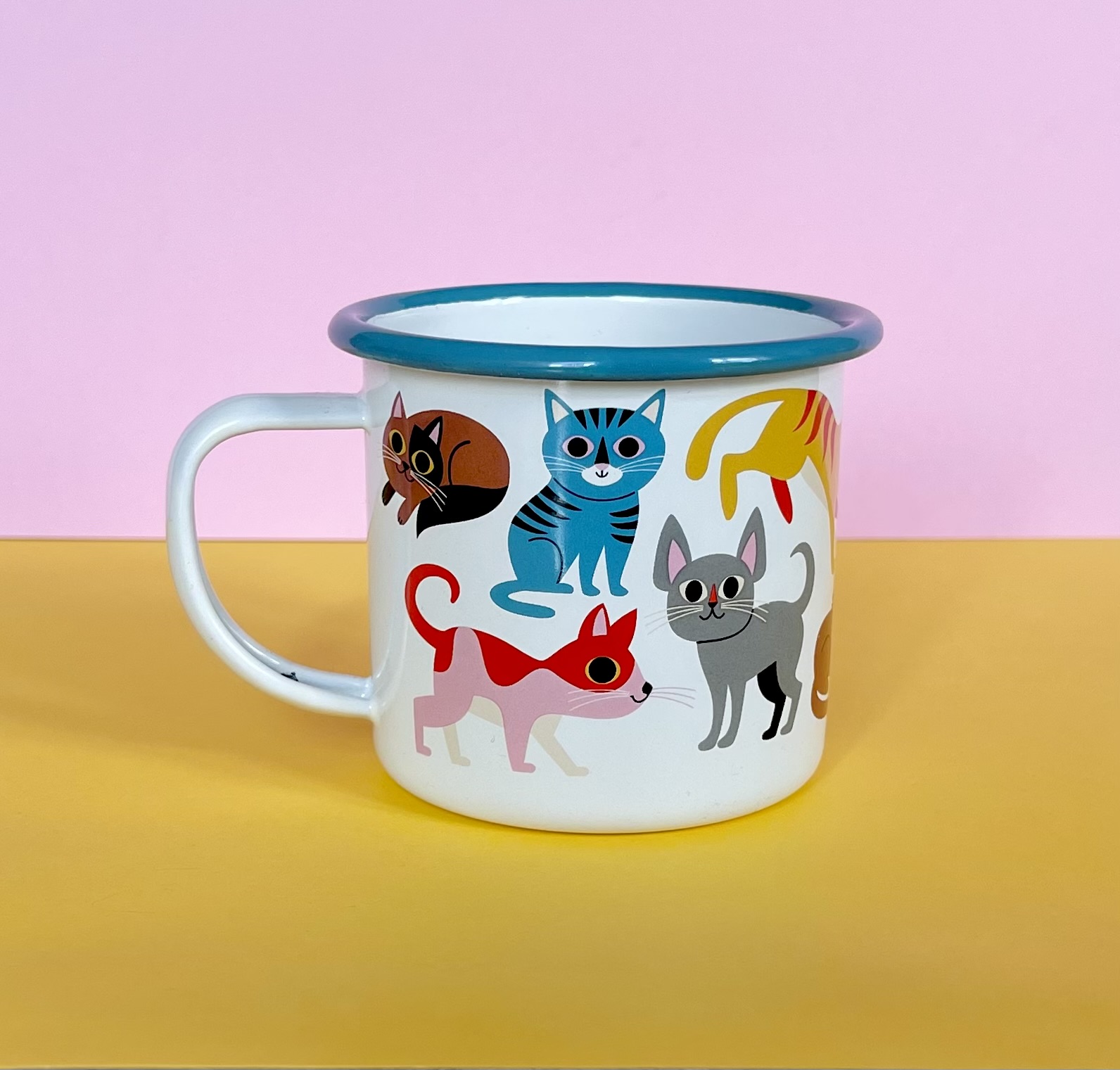 Wunderschöner Emaillebecher der schwedischen Designfirma Omm Design mit buntem Retromotiv für alle, die Katzen mögen. Perfekt als Mitbringsel oder Geschenk!