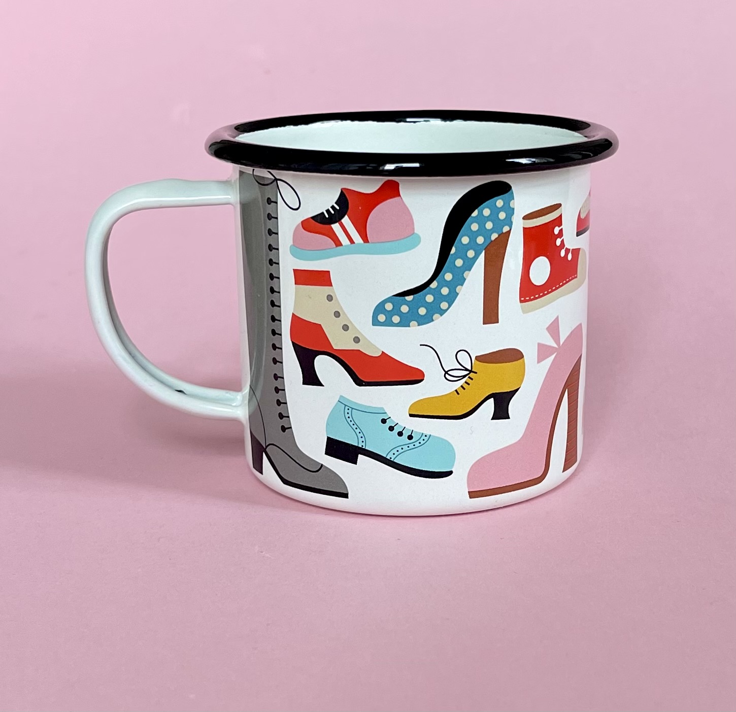Wunderschöner Emaillebecher der schwedischen Designfirma Omm Design mit buntem Retromotive für alle, die Schuhe mögen. Perfekt als Mitbringsel oder Geschenk!