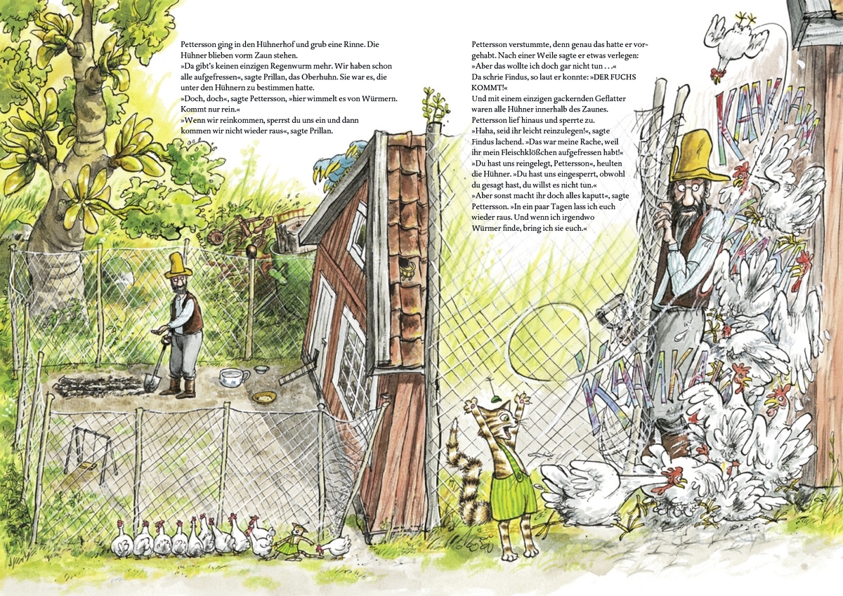 Die Illustrationen von Sven Nordqvist, bekannt für ihre Detailverliebtheit und den wimmelbildartigen Charakter, bereichern das Buch zusätzlich. Sie laden dazu ein, neben der Haupthandlung auch die vielen kleinen Nebengeschichten zu entdecken, die sich im Hintergrund abspielen. Diese visuelle Komponente fördert nicht nur die Beobachtungsgabe, sondern auch die Fantasie der jungen Leserinnen und Leser.