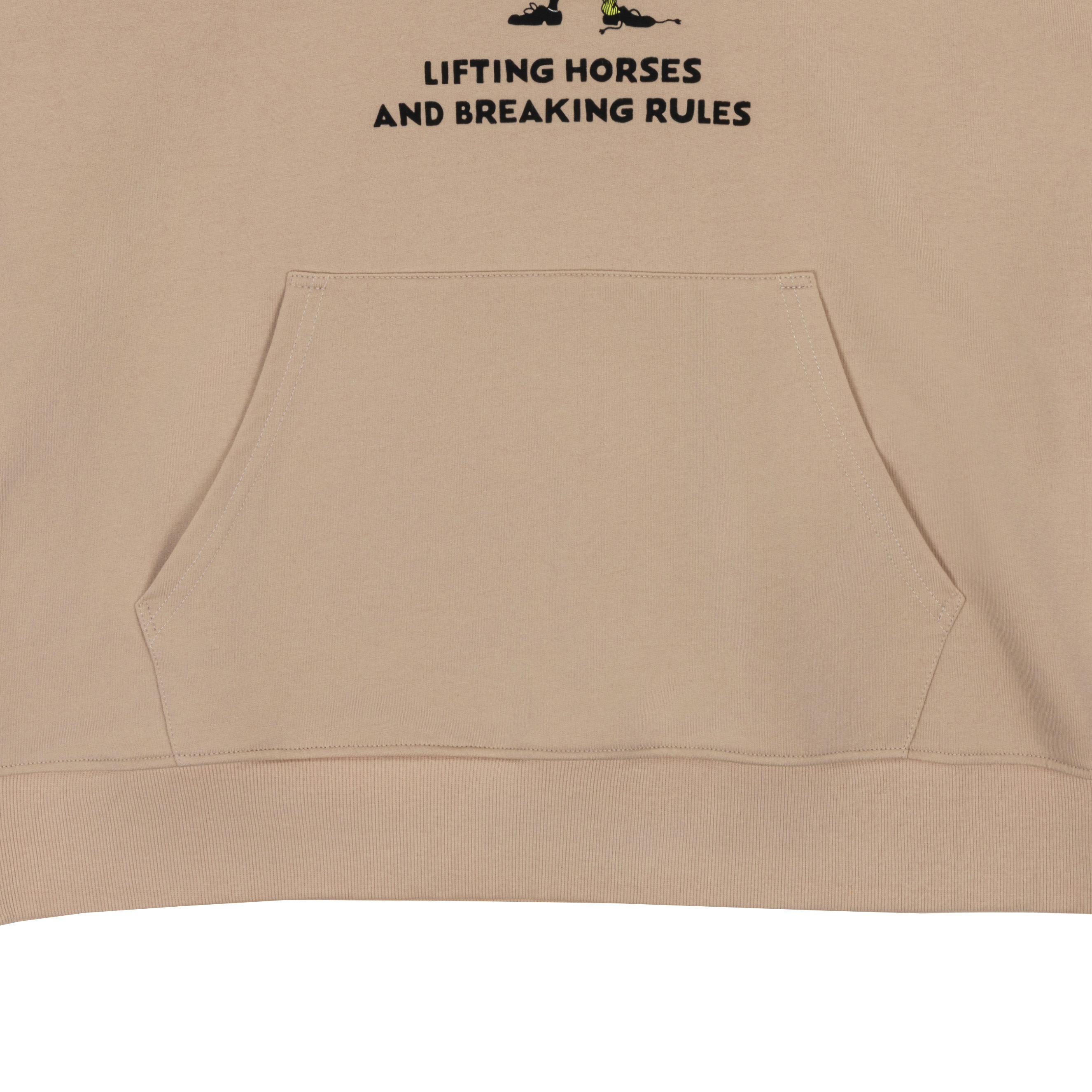 Cooler, beiger Kapuzenpullover für echte Pippi Langstrumpf Fans! Der Unisex-Hoodie hat lange Ärmel, eine Kängurutasche und eine Kapuze. Auf der Brust ist ein großer Pippi-Langstrumpf-Print. Pippi Langstrumpf hebt einhändig ihr Pferd 'Kleider Onkel' in die Höhe. Der ikonische Print hat 'Lifting horses and breaking rules' als Bildunterschrift. Pippi Langstrumpf ist das stärkste Mädchen der Welt und bekannt für ihre seitlichen Zöpfe und ihre farbenfrohe Kleidung.