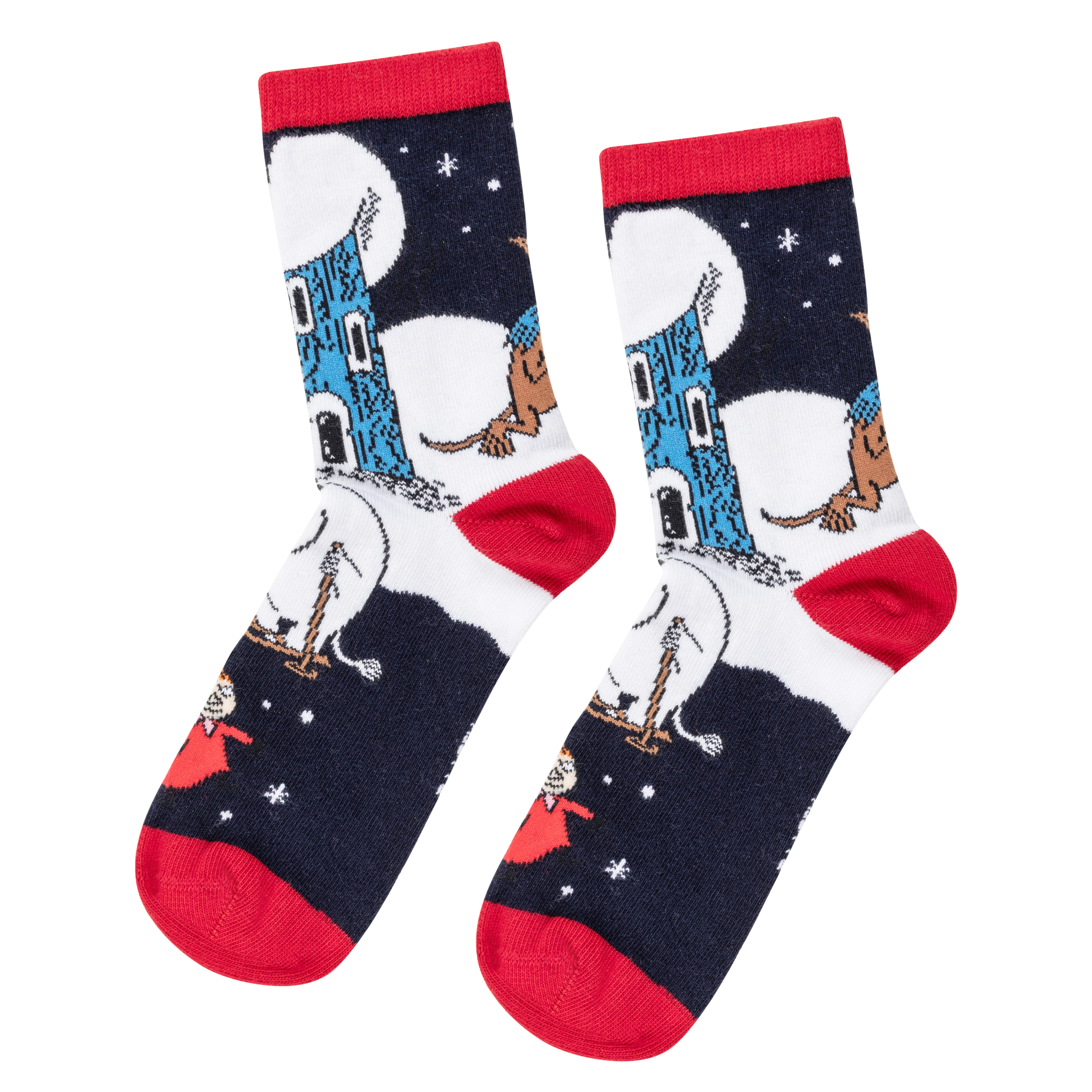 Schöne Kindersocken mit winterlichem Muminmotiv.