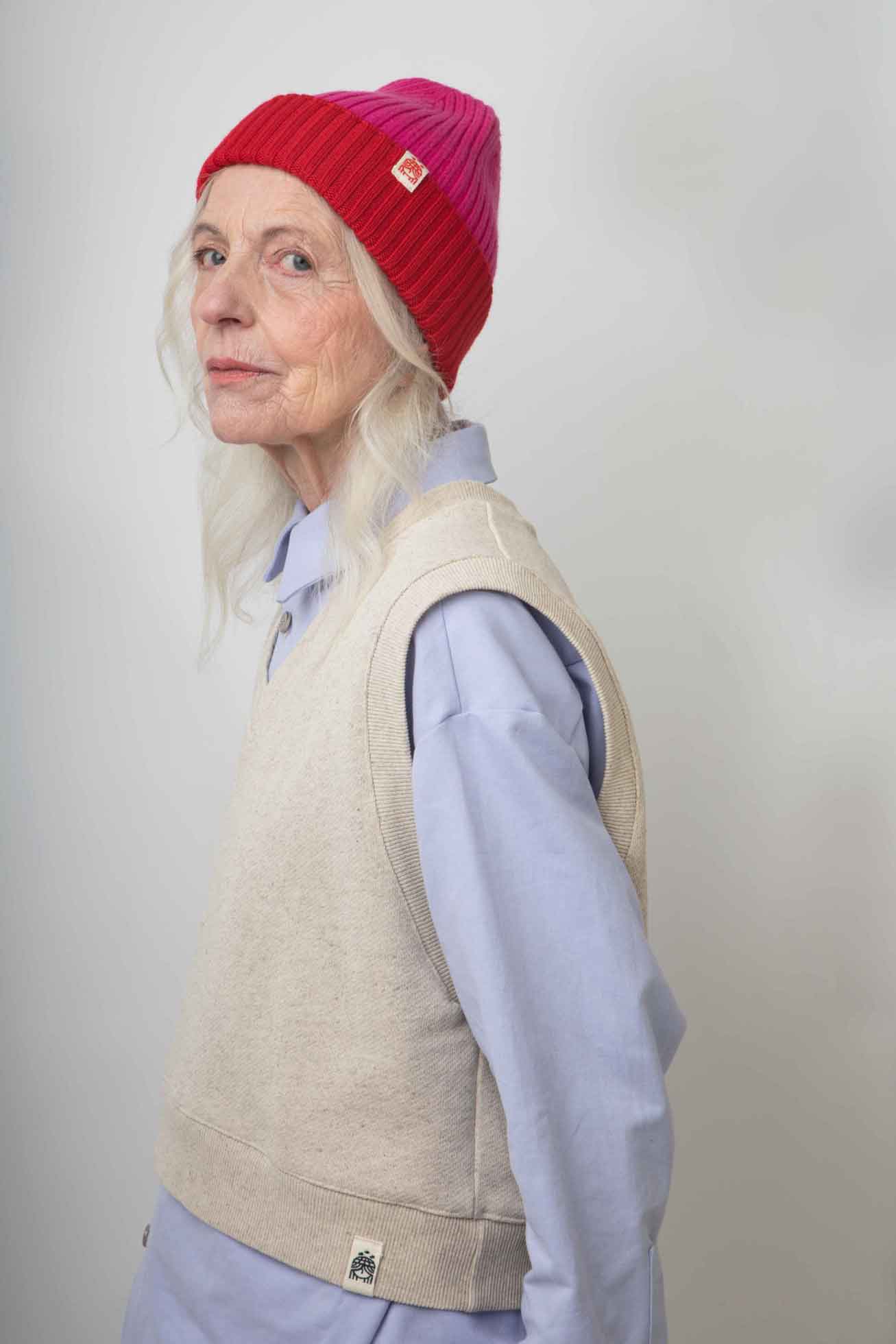 Die abstehende Strickmütze sitzt angenehm am Kopf, passt sich dem Umfang bequem an und bedeckt dabei die Ohren. Durch ihre besondere Form trägt sie sich lässig und steht leicht ab.