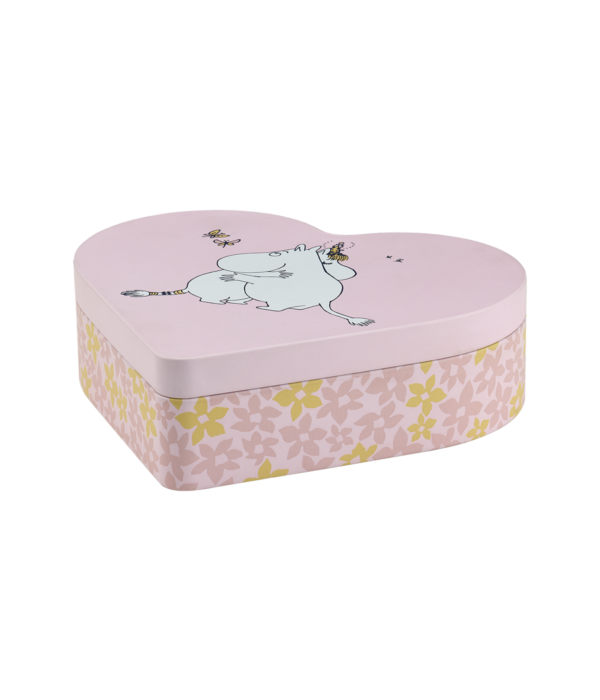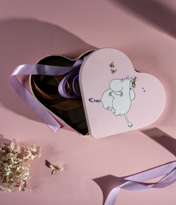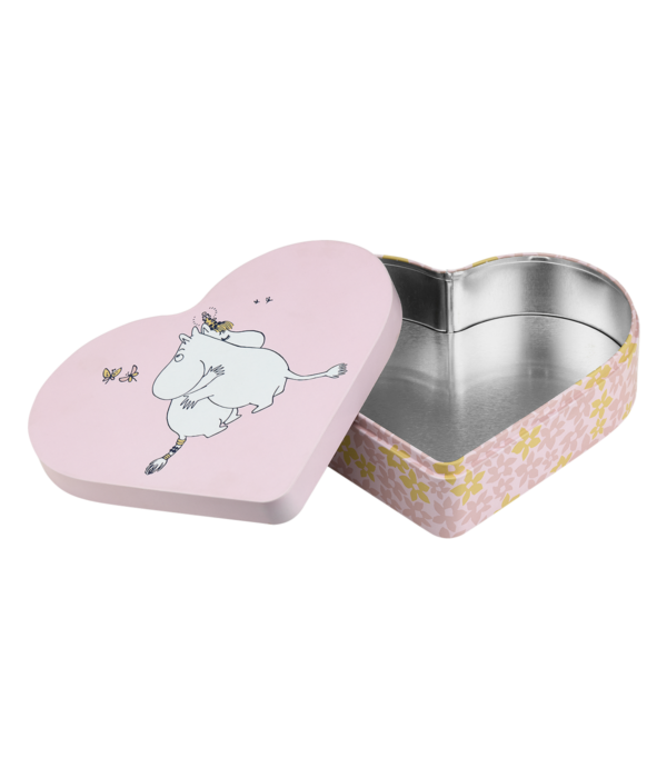 Süße, herzförmige Blechdose mit Deckel und Mumin Motiv.