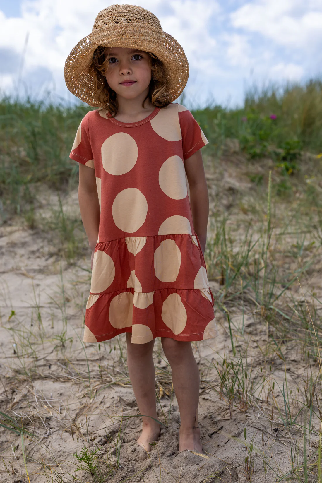 Ein Kleid wie gemacht für aufregende Sommer-Abenteuer oder festliche Anlässe. Das Kleid ist weich und bequem, bietet jeden Freiraum den aktive Kinder brauchen. Ist dennoch zugleich sehr besonders durch den gerafften Rocksaum und dem verspieltem Polkadot-Aufdruck.