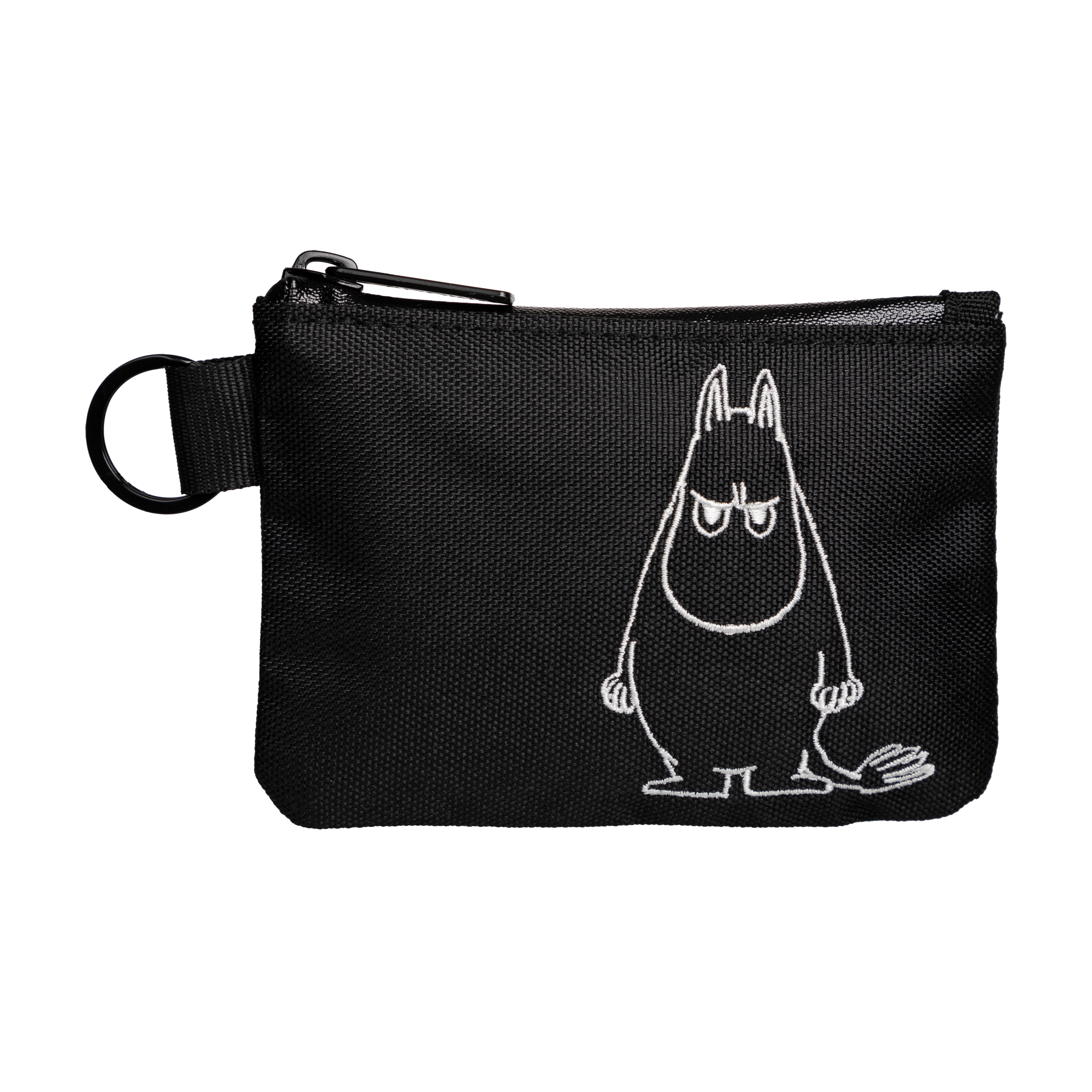 Cooles schwarzes Portemonnaie mit Reißverschluss und Metallring. Auf dem Portemonnaie befindet sich der "Angry Moomin".