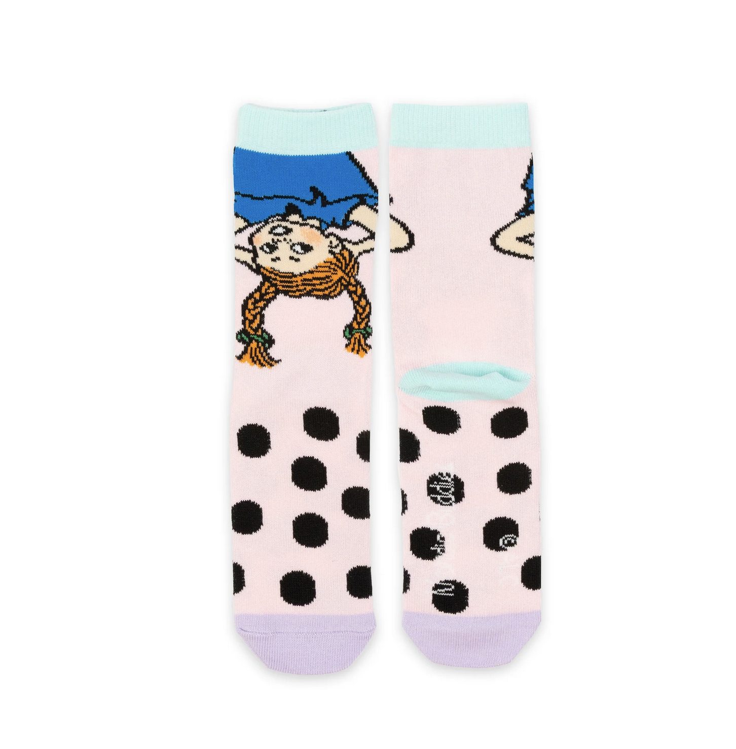 Farbenfrohe Farbkombi aus Rosa und Blau, witzige Kleiner Onkel Flecken und ikonisches Pippi Langstrumpf Motiv machen diese Socken zum absolutem Lieblingspaar in der Sockenschublade.