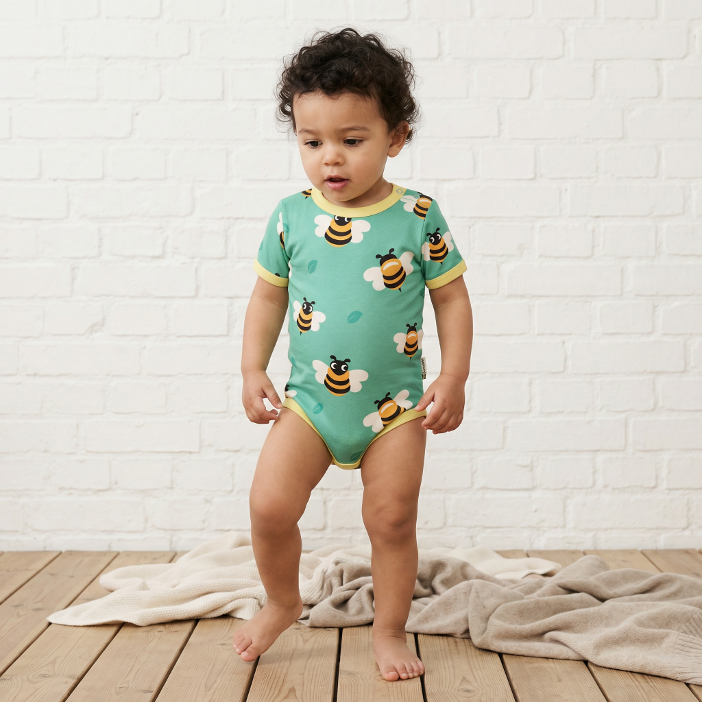 Nachhaltiger Babybody mit fröhlichem Bienenmuster.