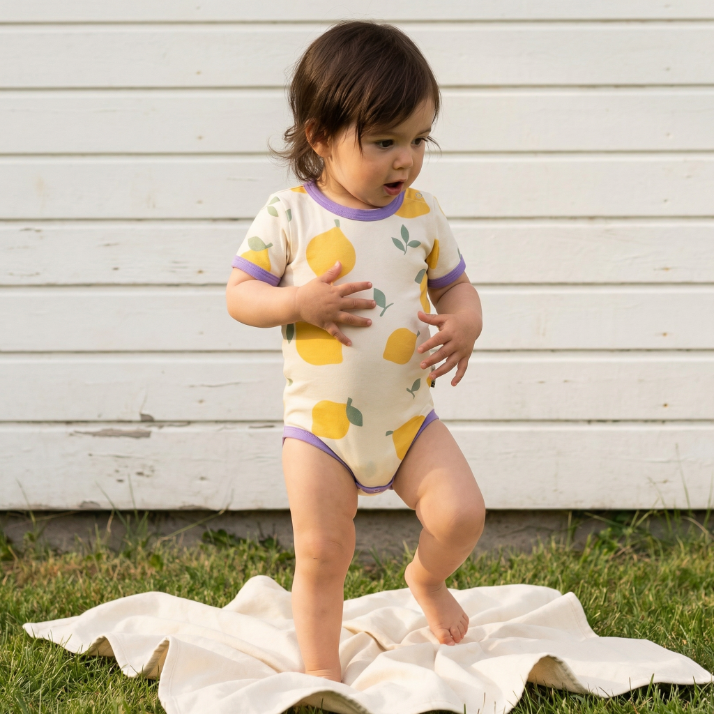 Nachhaltiger Babybody mit fröhlichem Zitronenmuster..