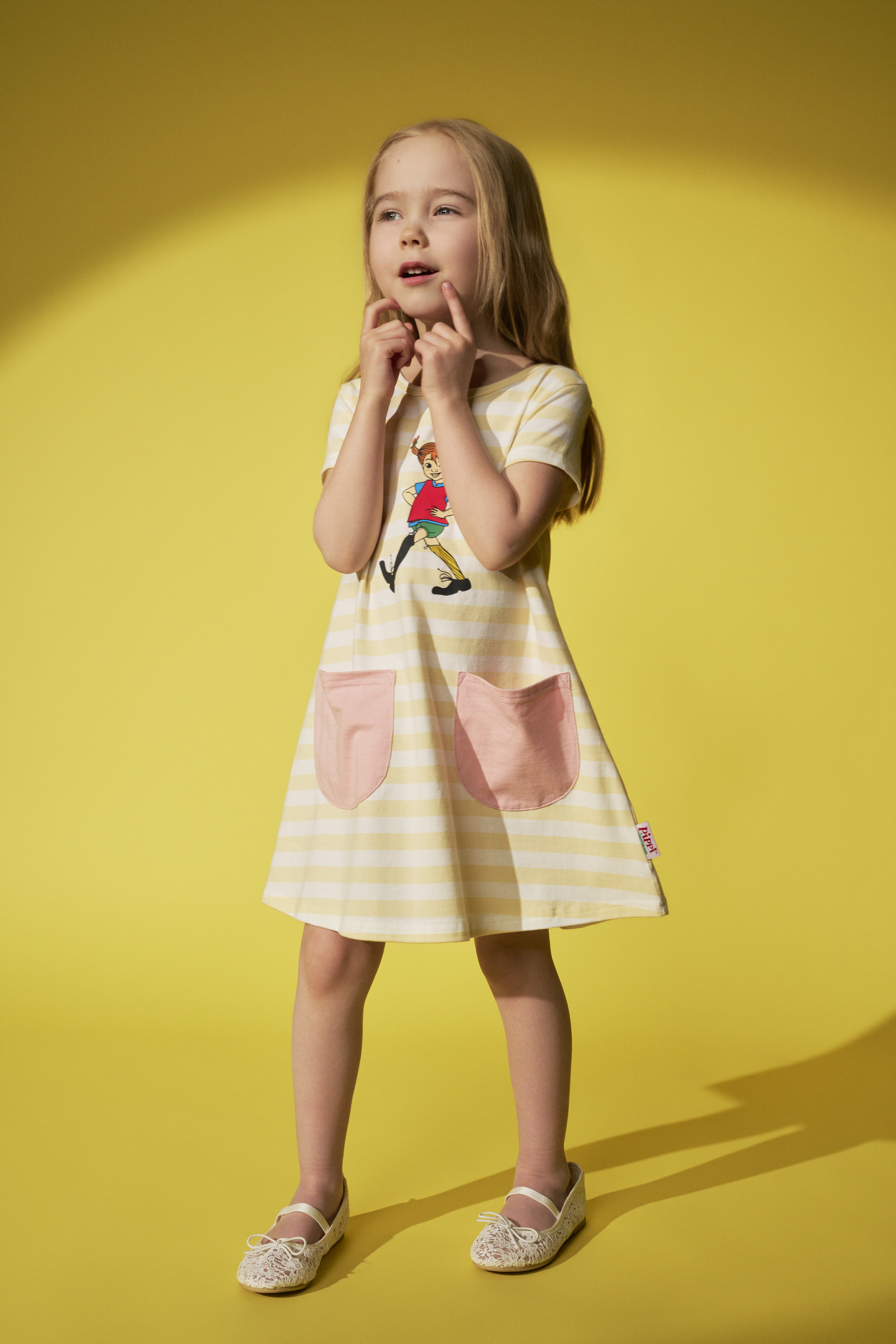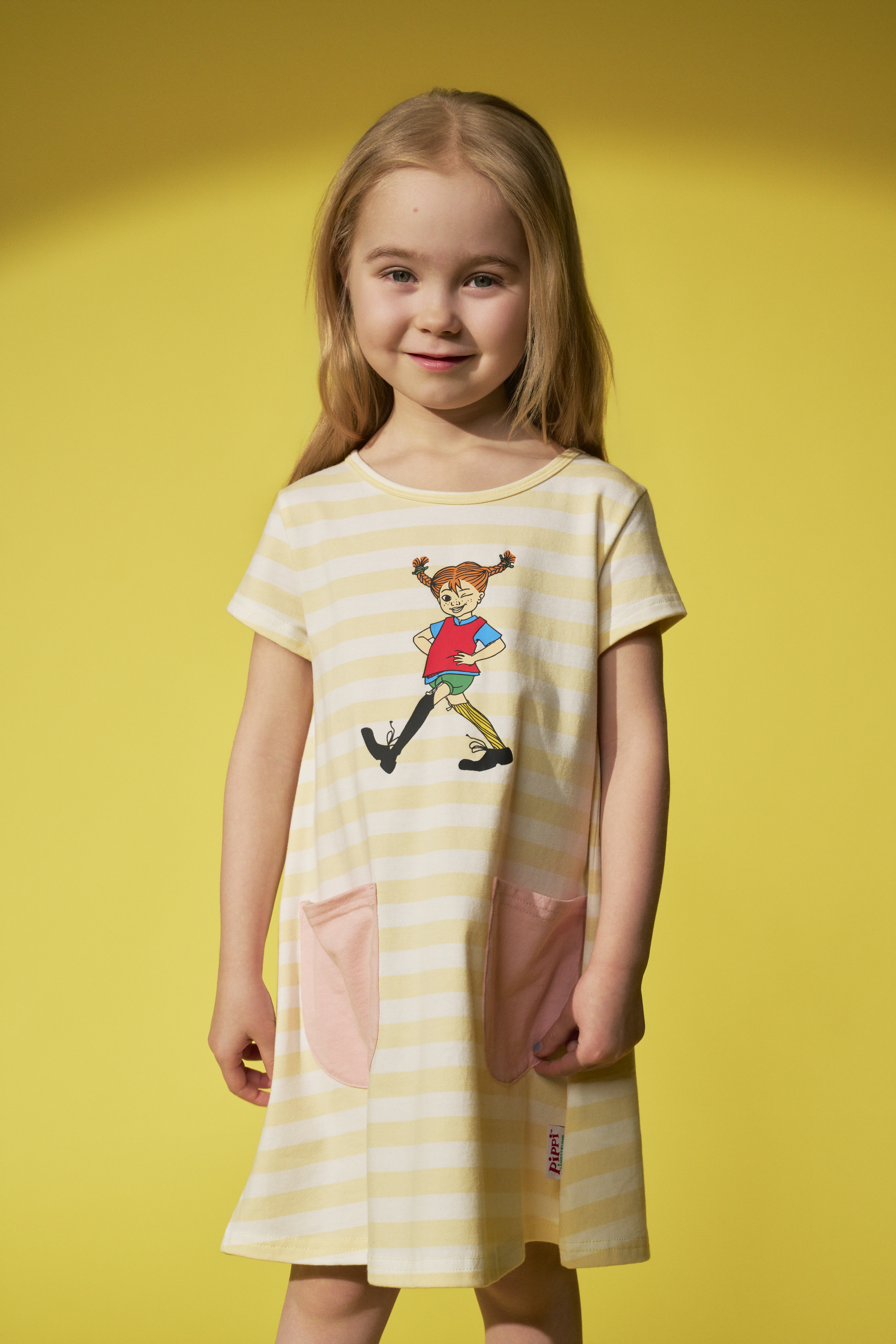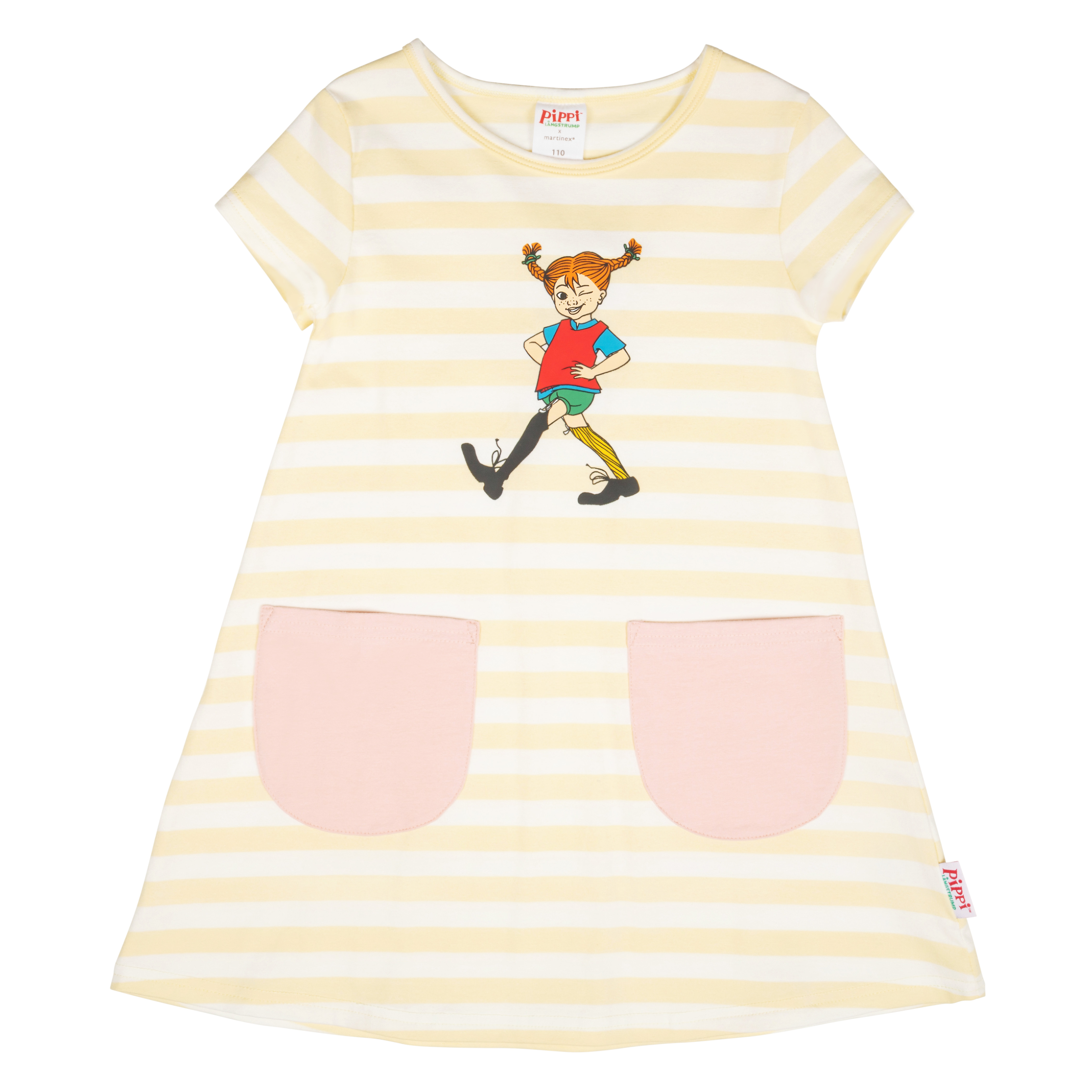 Gestreiftes Kinderkleid in A-Linie mit Aufgesetzten Taschen. Auf der Brust befindet sich ein Aufdruck von Pippi Langstrumpf.