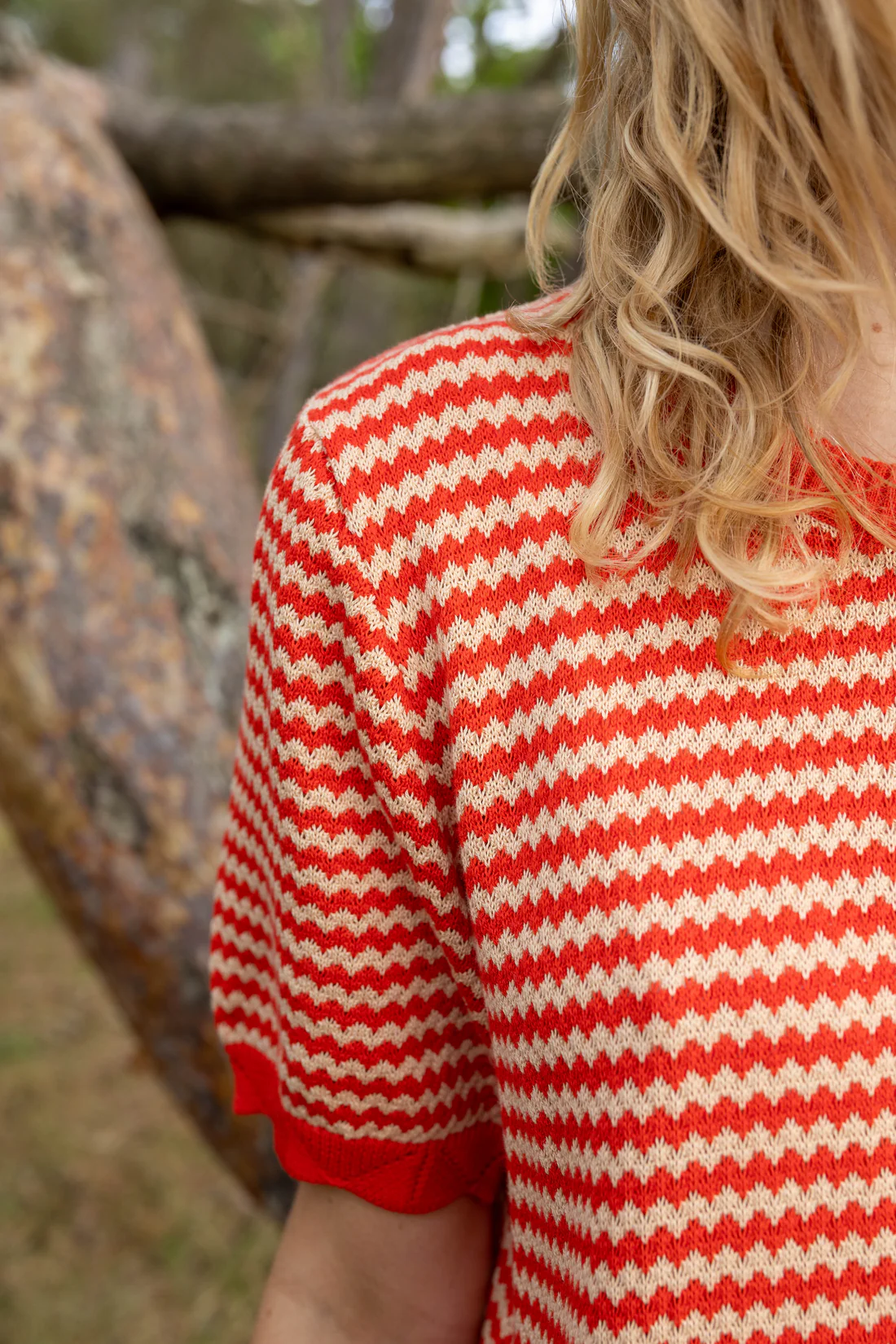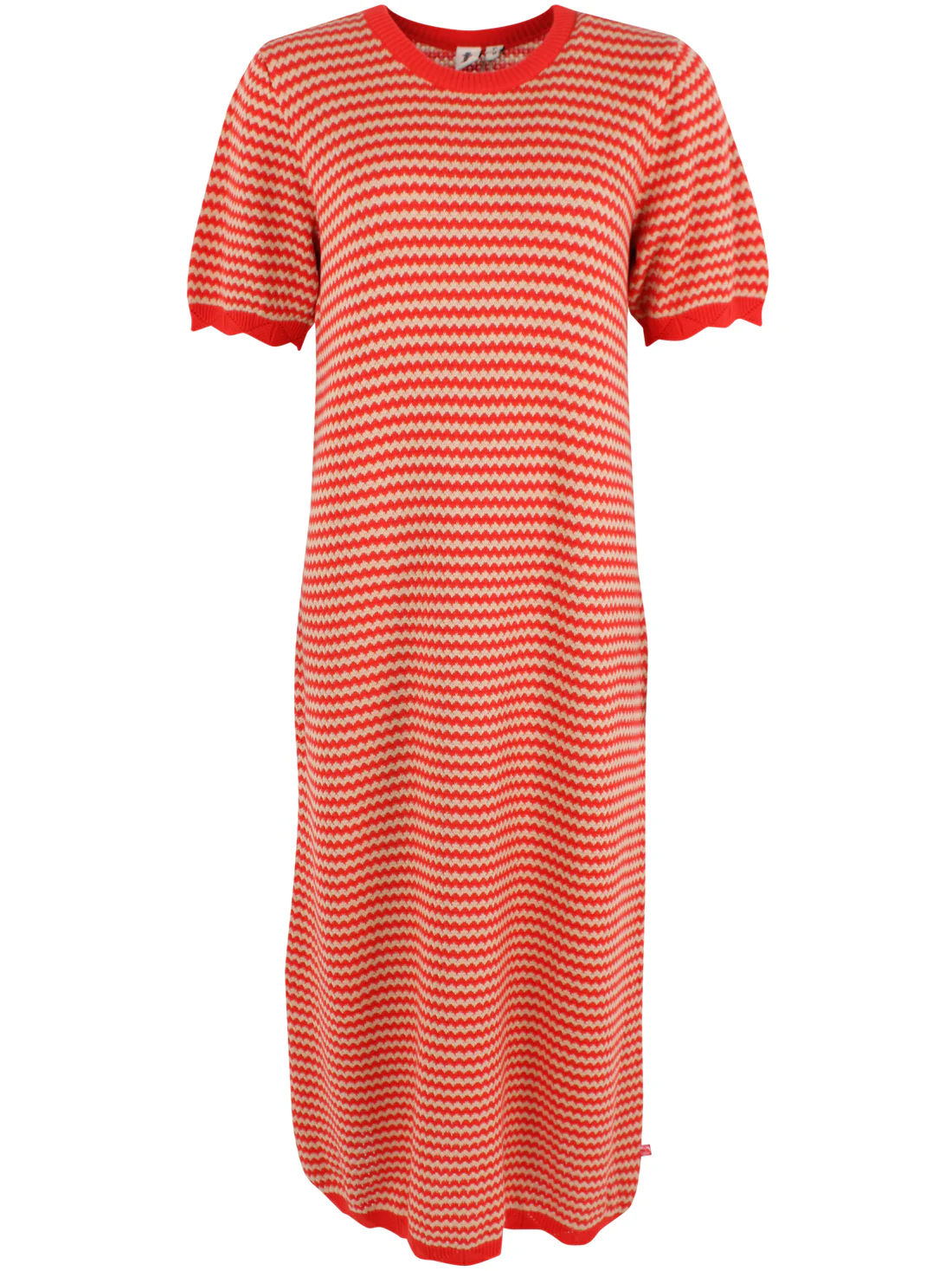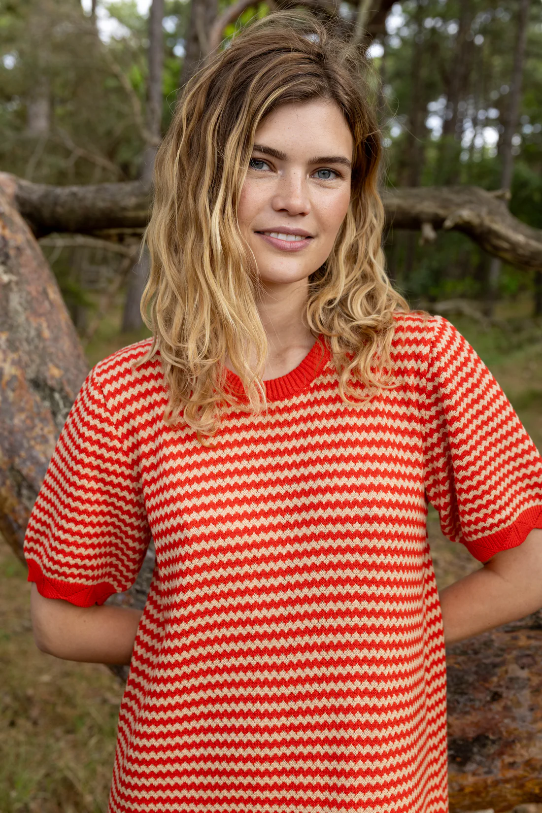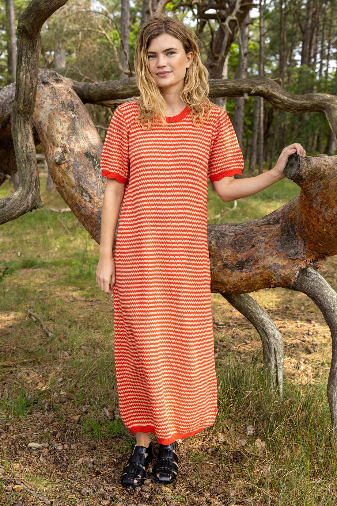 Sommerliches Strickkleid mit Streifen in Orange und Beige.