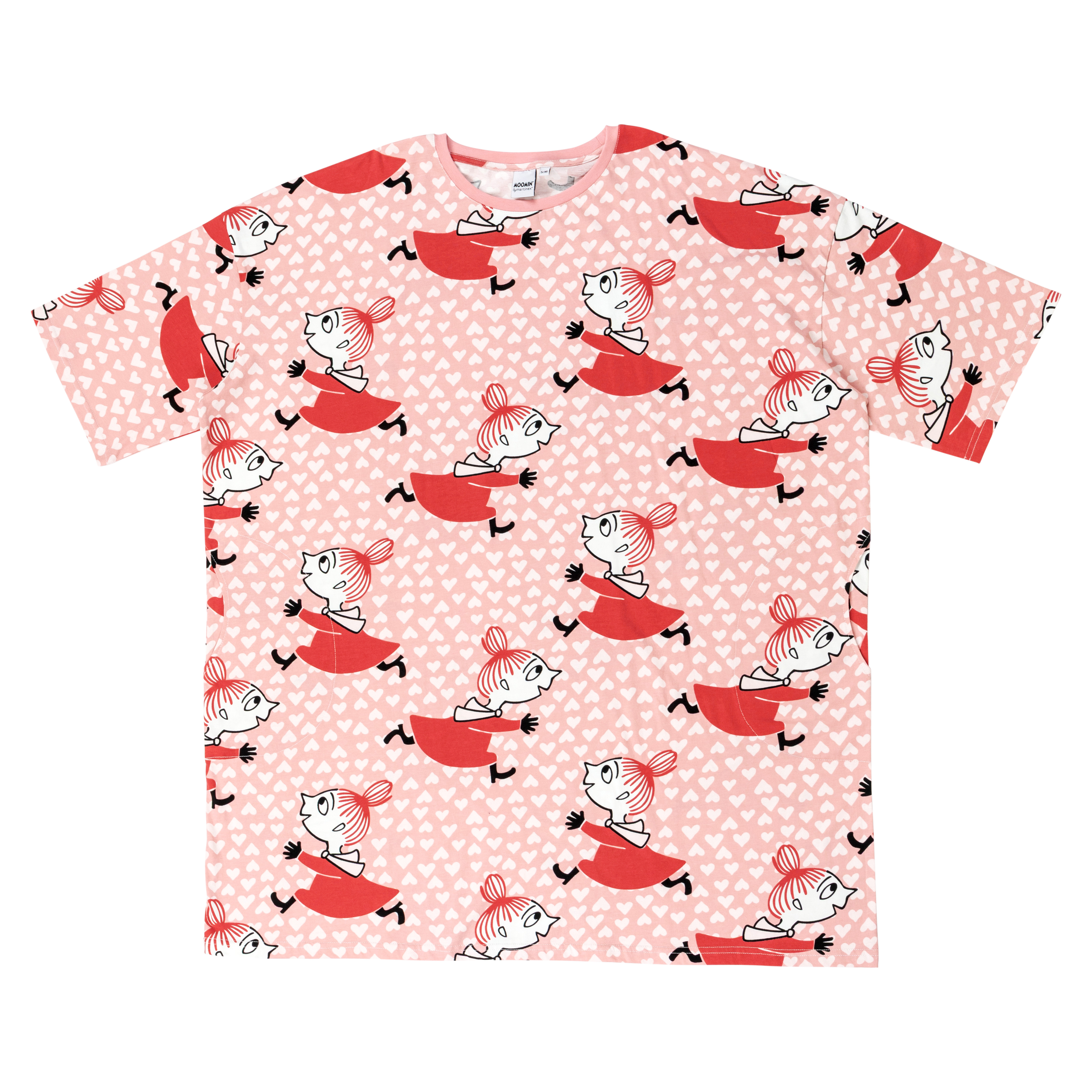Das rosa Riesen-T-Shirt hat kurze Ärmel und eine lockere, übergroße Passform. Das Nachthemd hat den Print „Joyful My“, mit einem fröhlichen kleinen My, der vor einem herzlichen Hintergrund herumläuft.