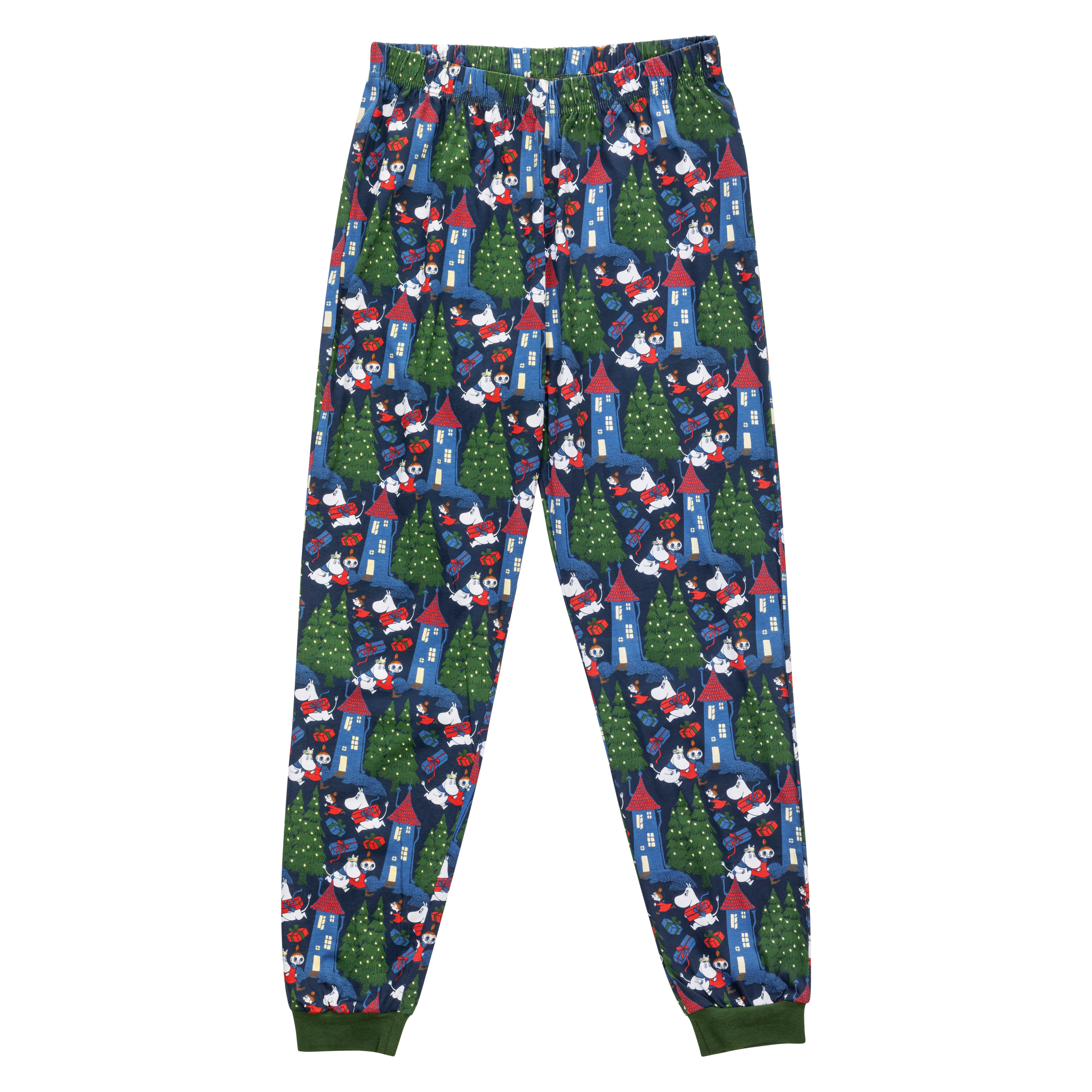 Dunkelblauer Pyjama mit winterlichem Mumin-Motiv für Erwachsene.
