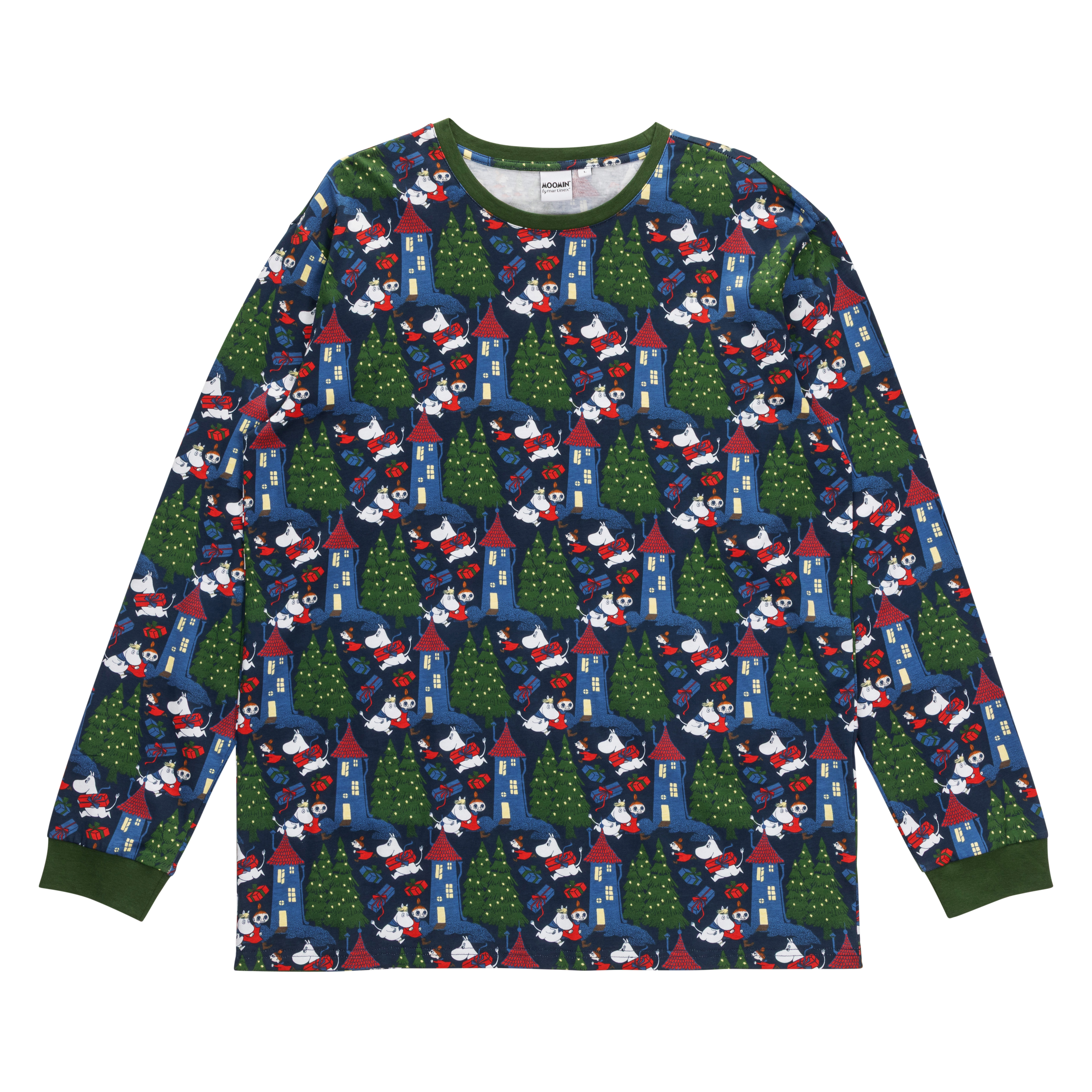 Dunkelblauer Pyjama mit winterlichem Mumin-Motiv für Erwachsene.