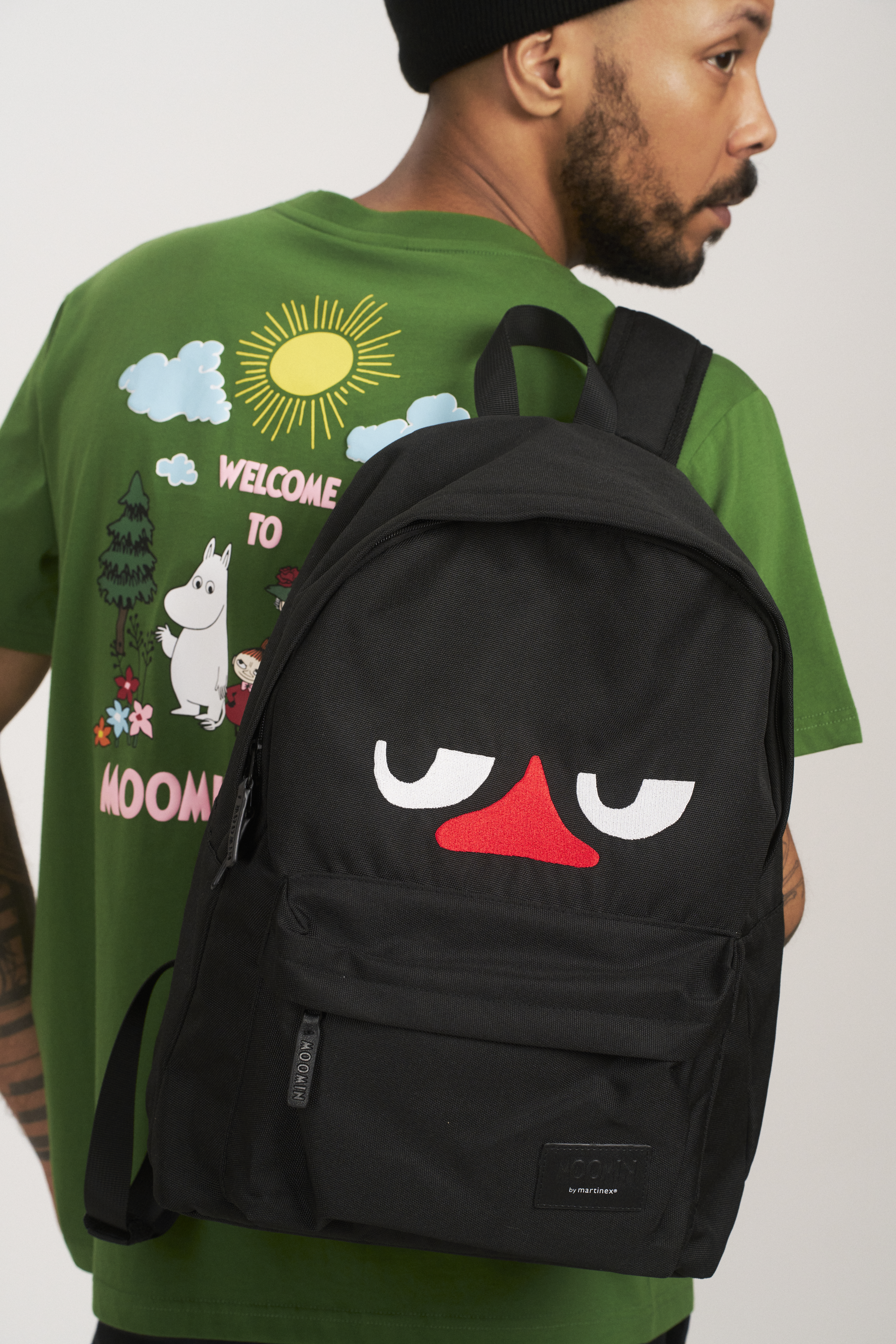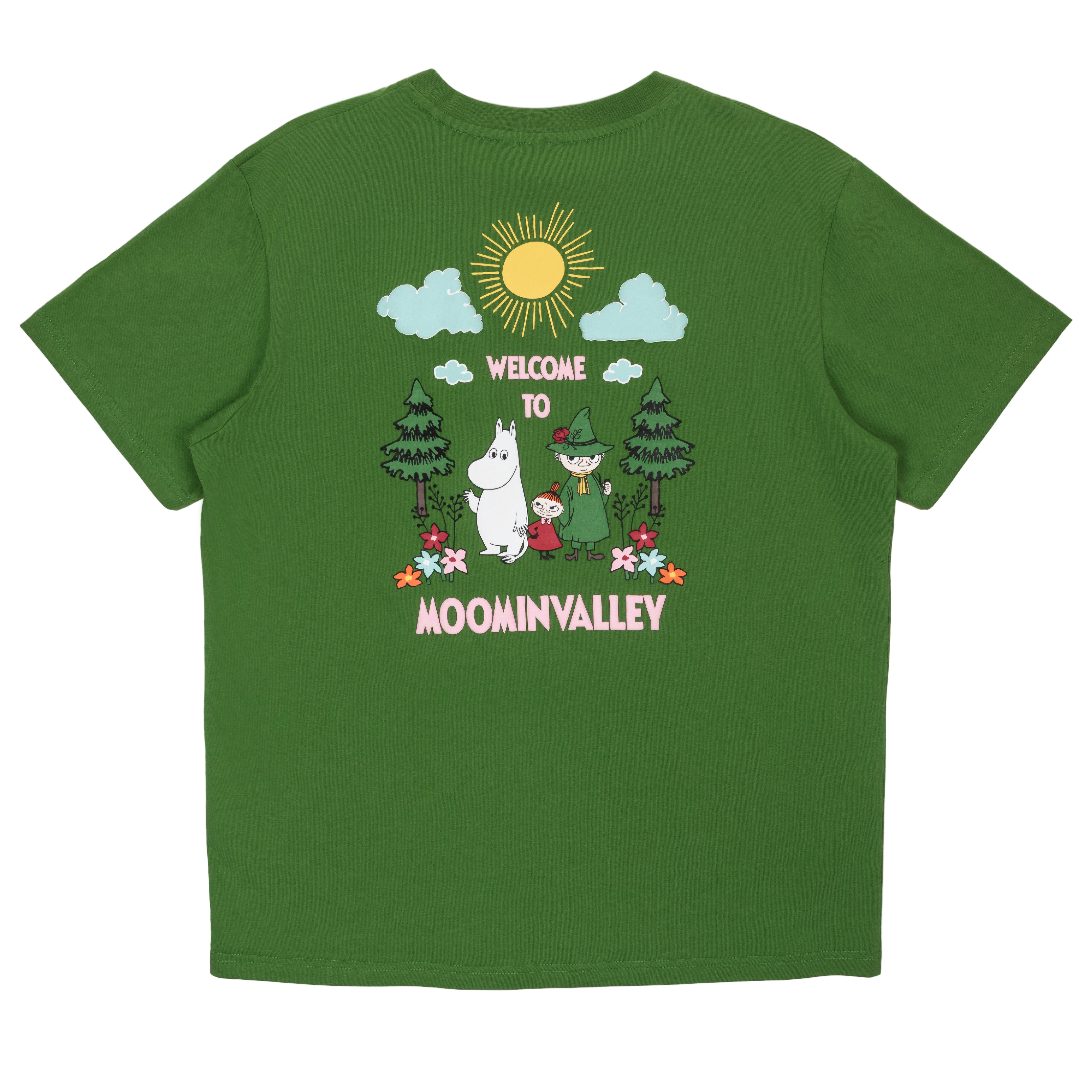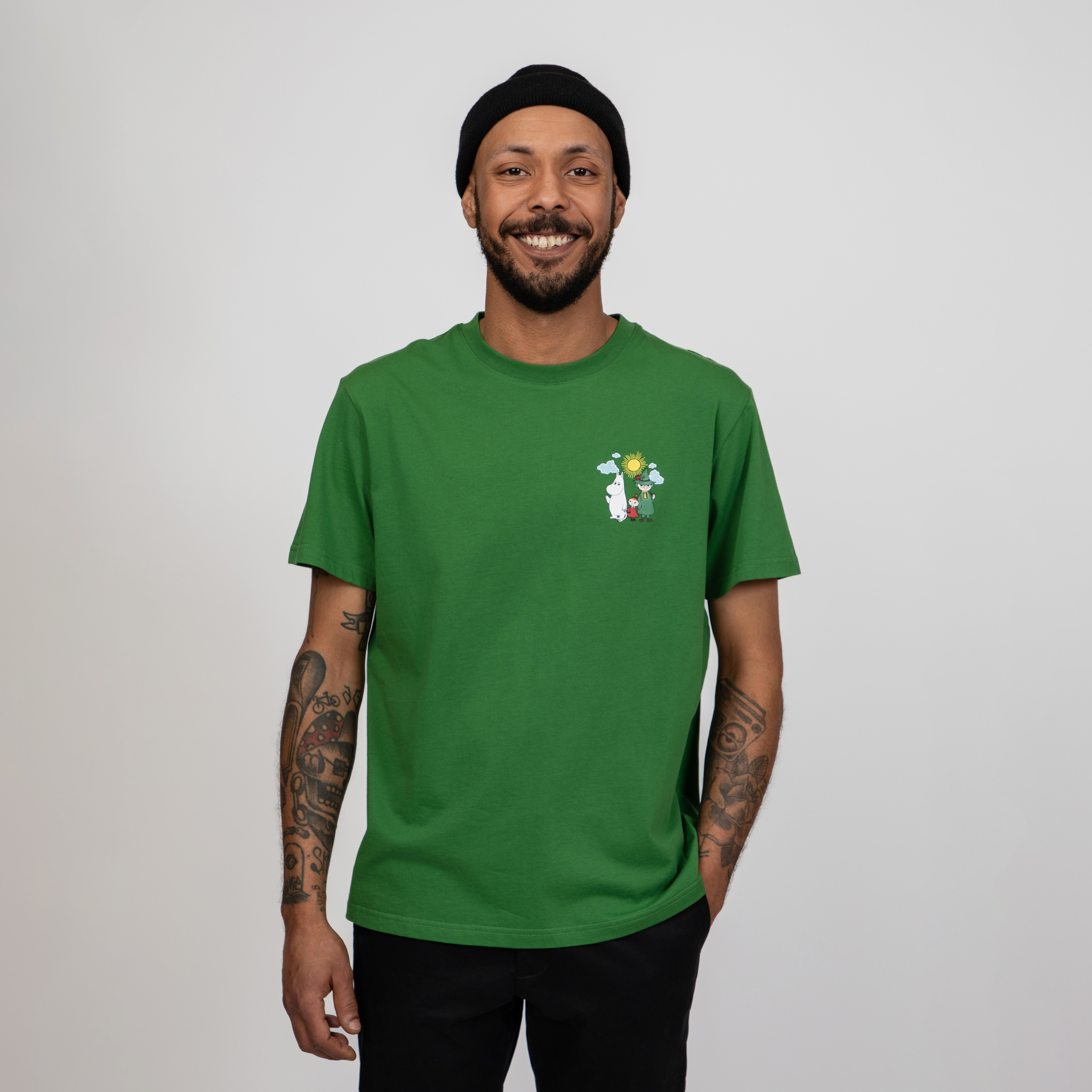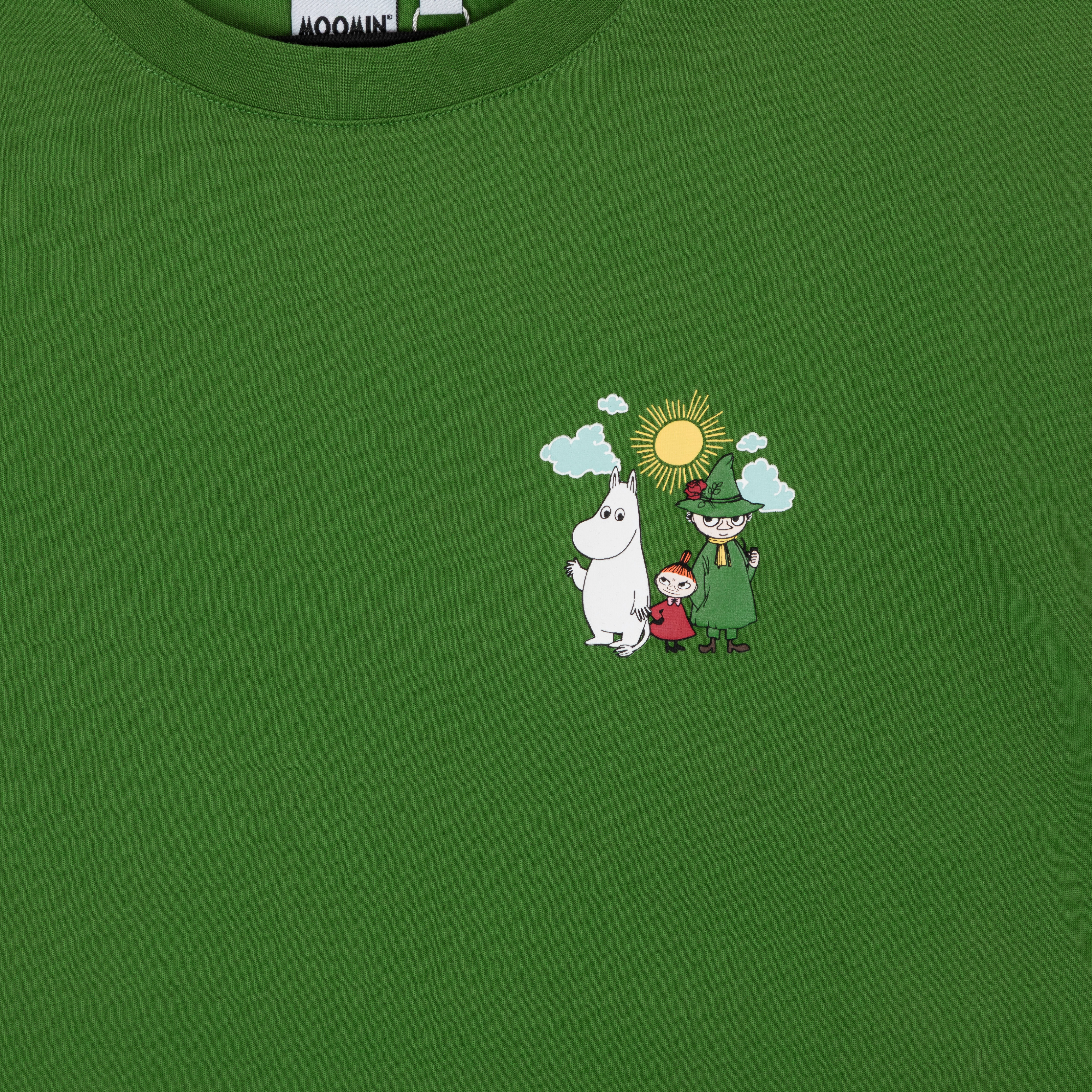 Cooles Mumin T-Shirt für Erwachsene mit kleinem Mumin-Motiv vorne und großem Print auf dem Rücken.