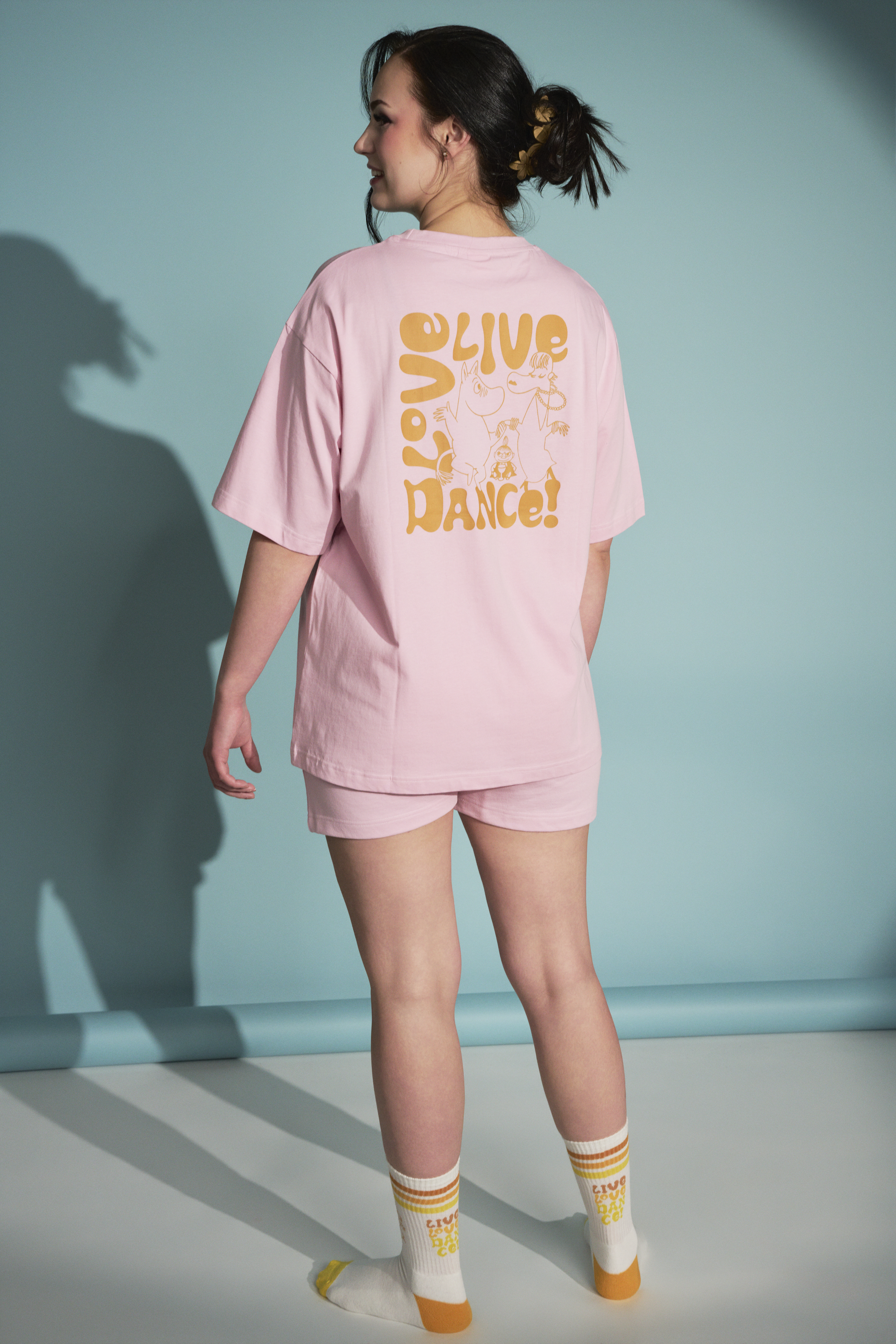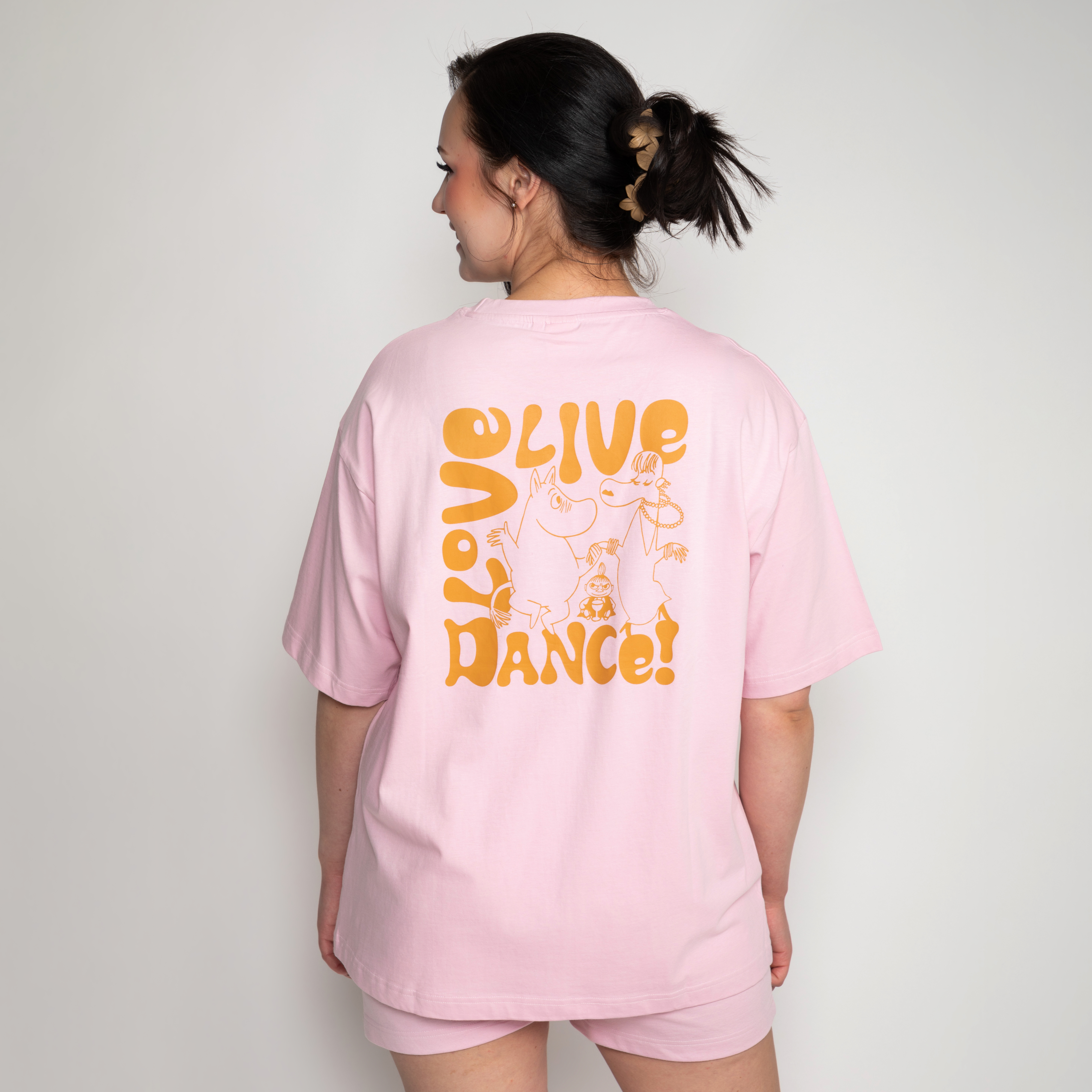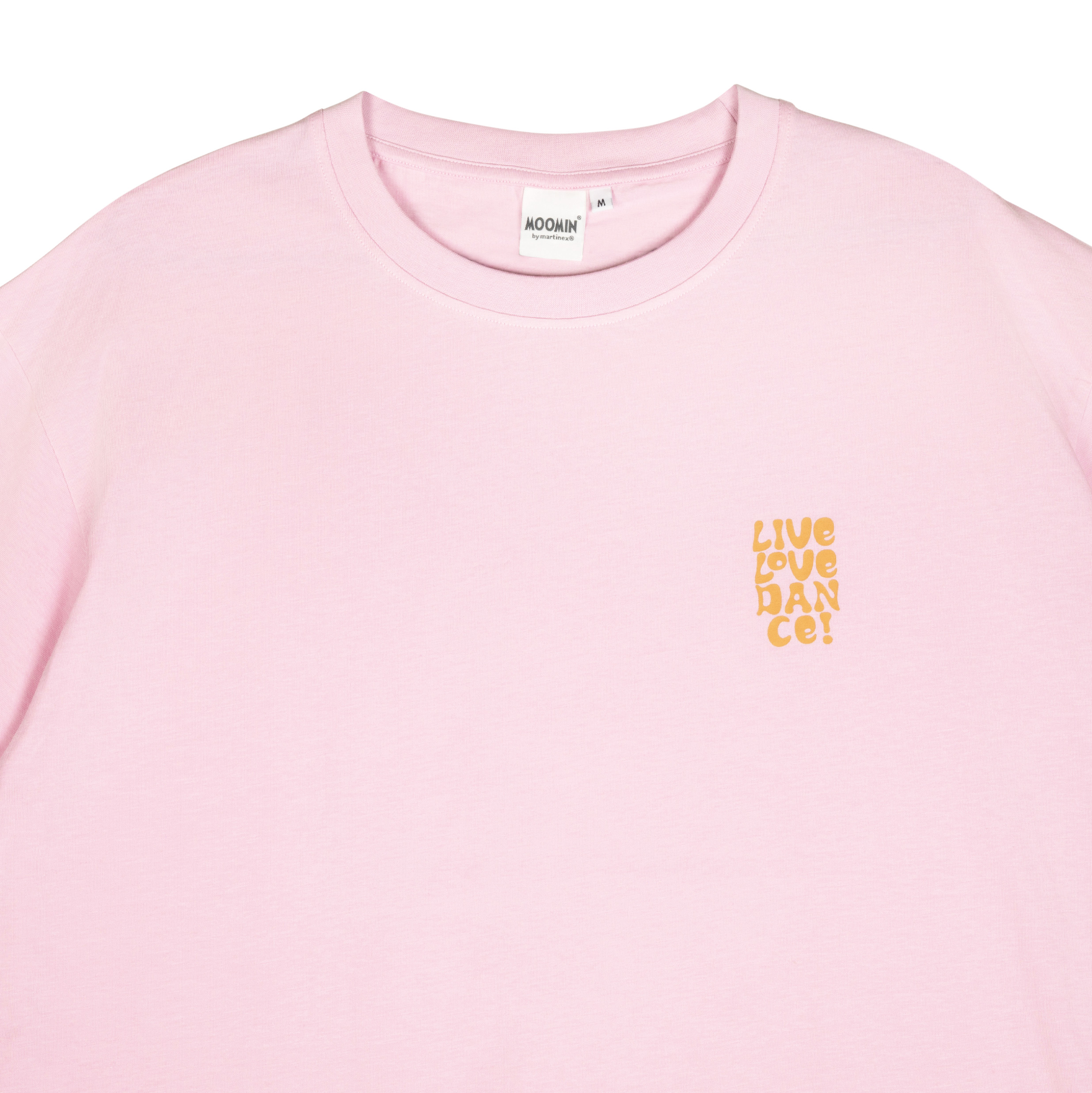 Auf der Brust ist ein kleiner Schriftzug auf der Brust 'Live-Love-Dace". Auf dem Rücken ist ein großer Print von Mumintroll beim Tanzen mit seinen Freunden.