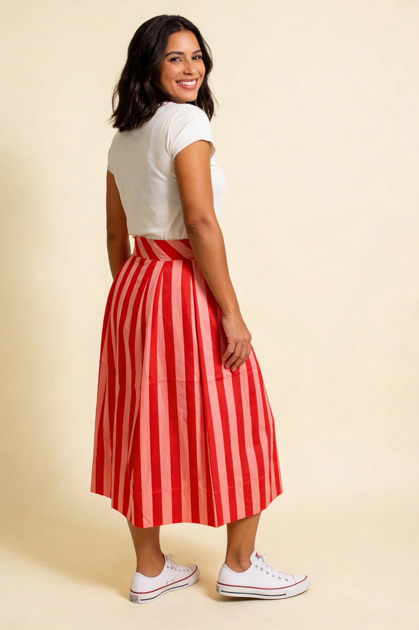Der Taylor-Rock in breiten pink-roten Streifen wird dein Lieblingsteil in deinem Kleiderschrank.