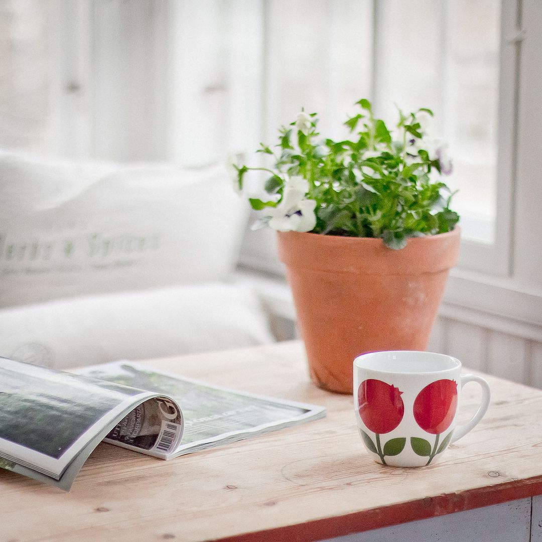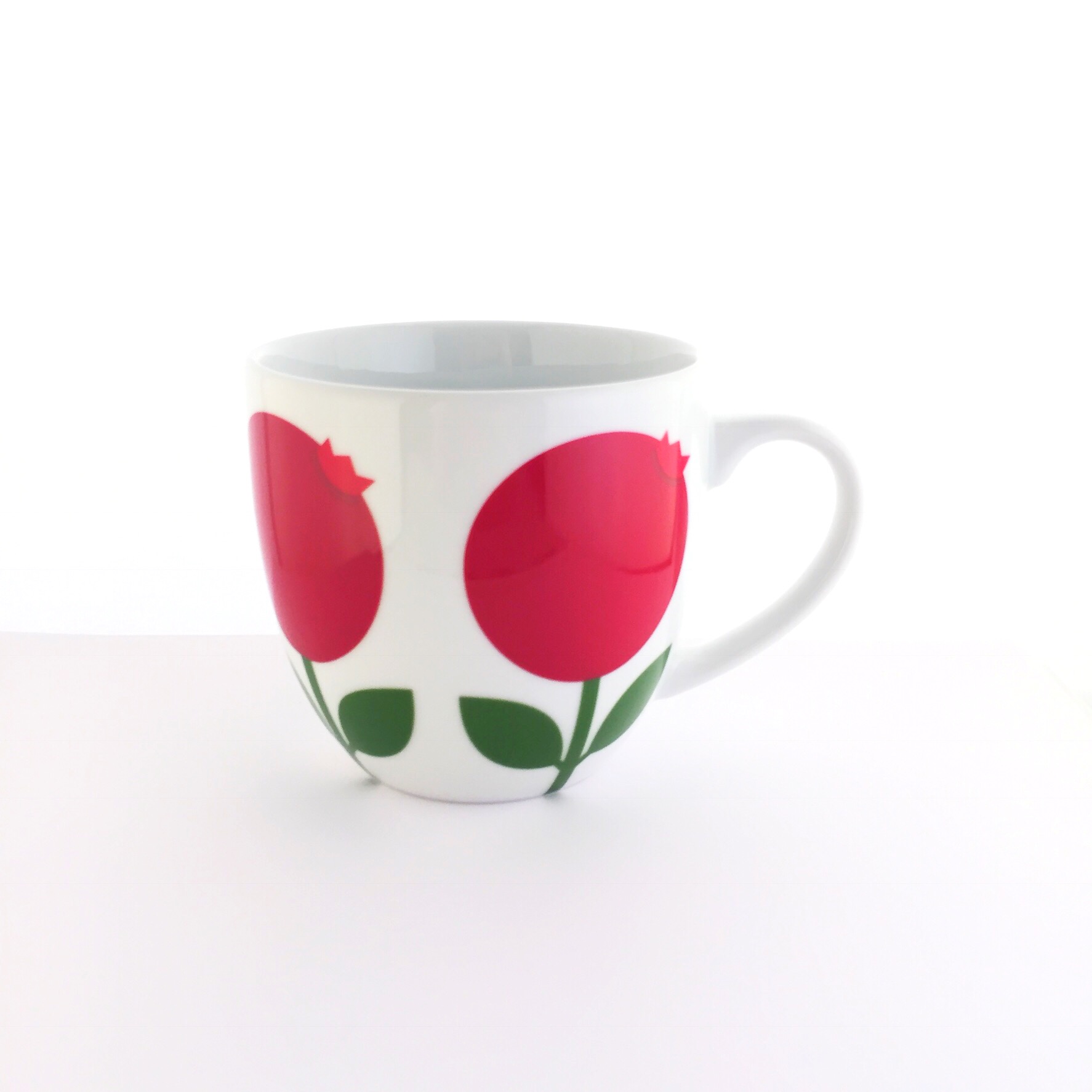 Supertolle, große Porzellantasse für eine extra Portion Kaffee oder einen beruhigenden Tee. Traumhaft schön ist das weiße Porzellan mit dem knallroten Retro-Preiselbeer-Motiv.