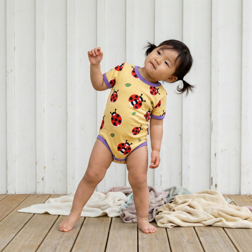 Schöner Body in zartem Gelb mit kurzen Ärmeln und einem fröhlichen Marienkäfer-Print.