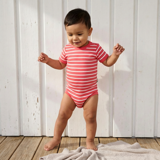 Nachhaltiger Babybody, rot-weiß gestreift.
