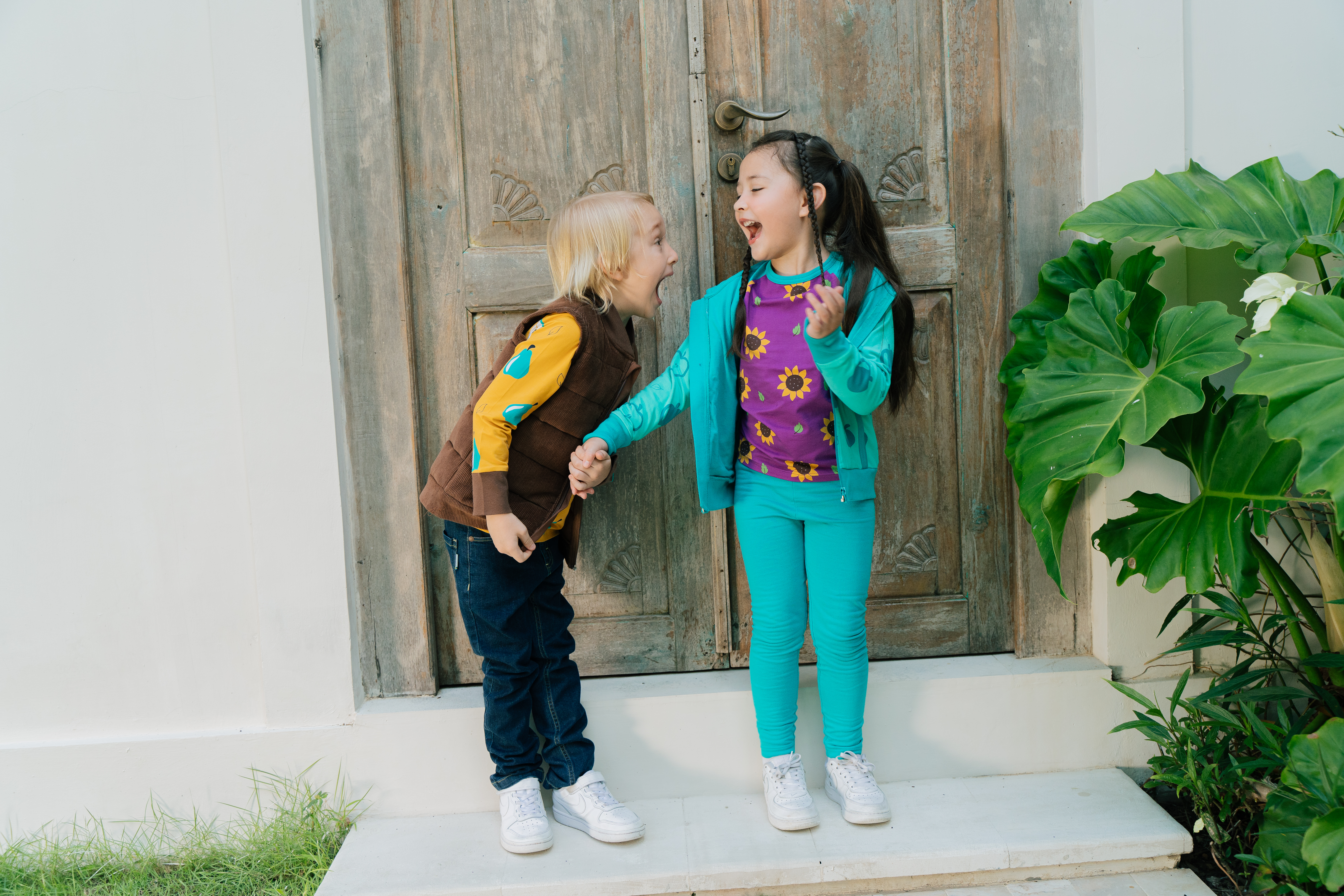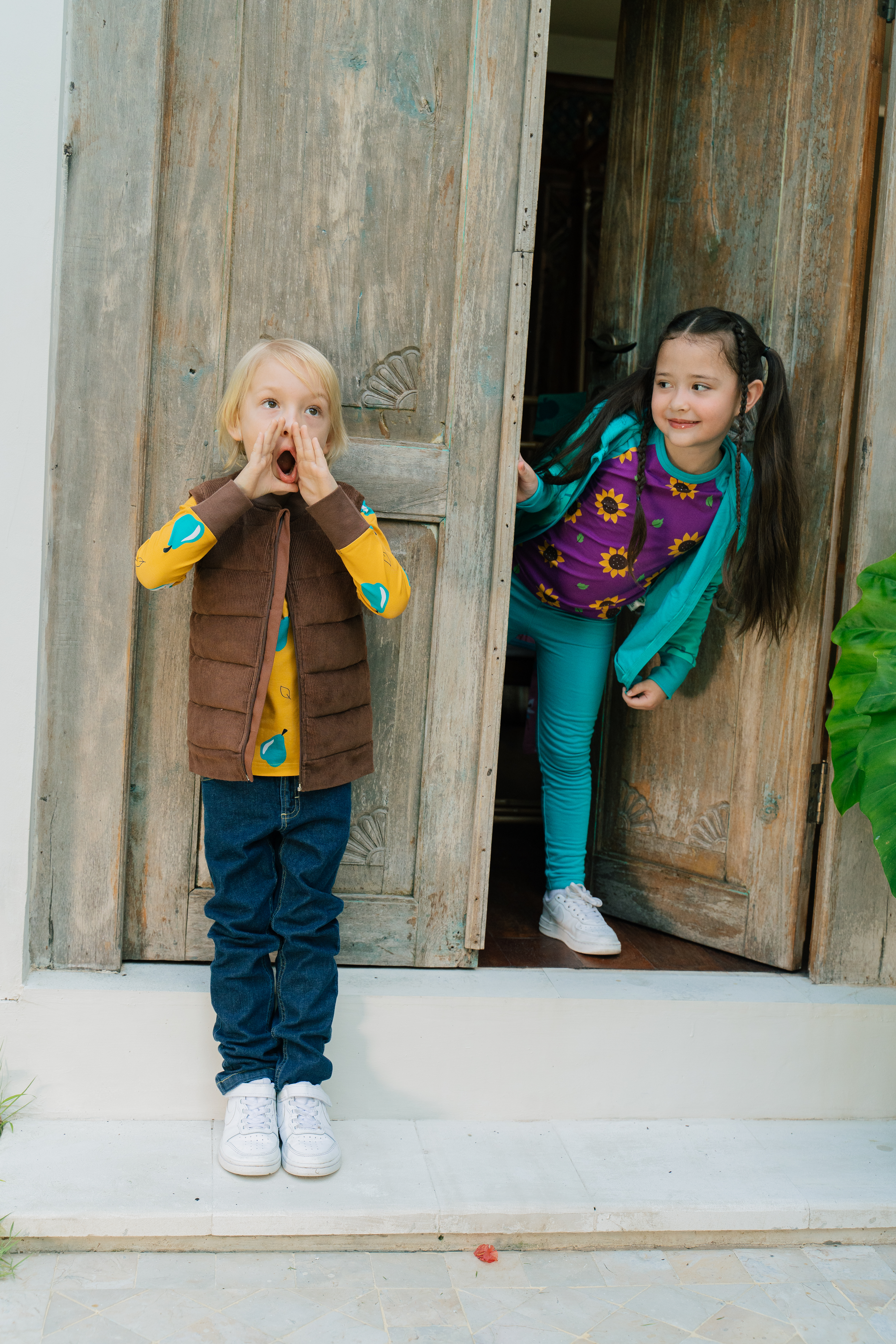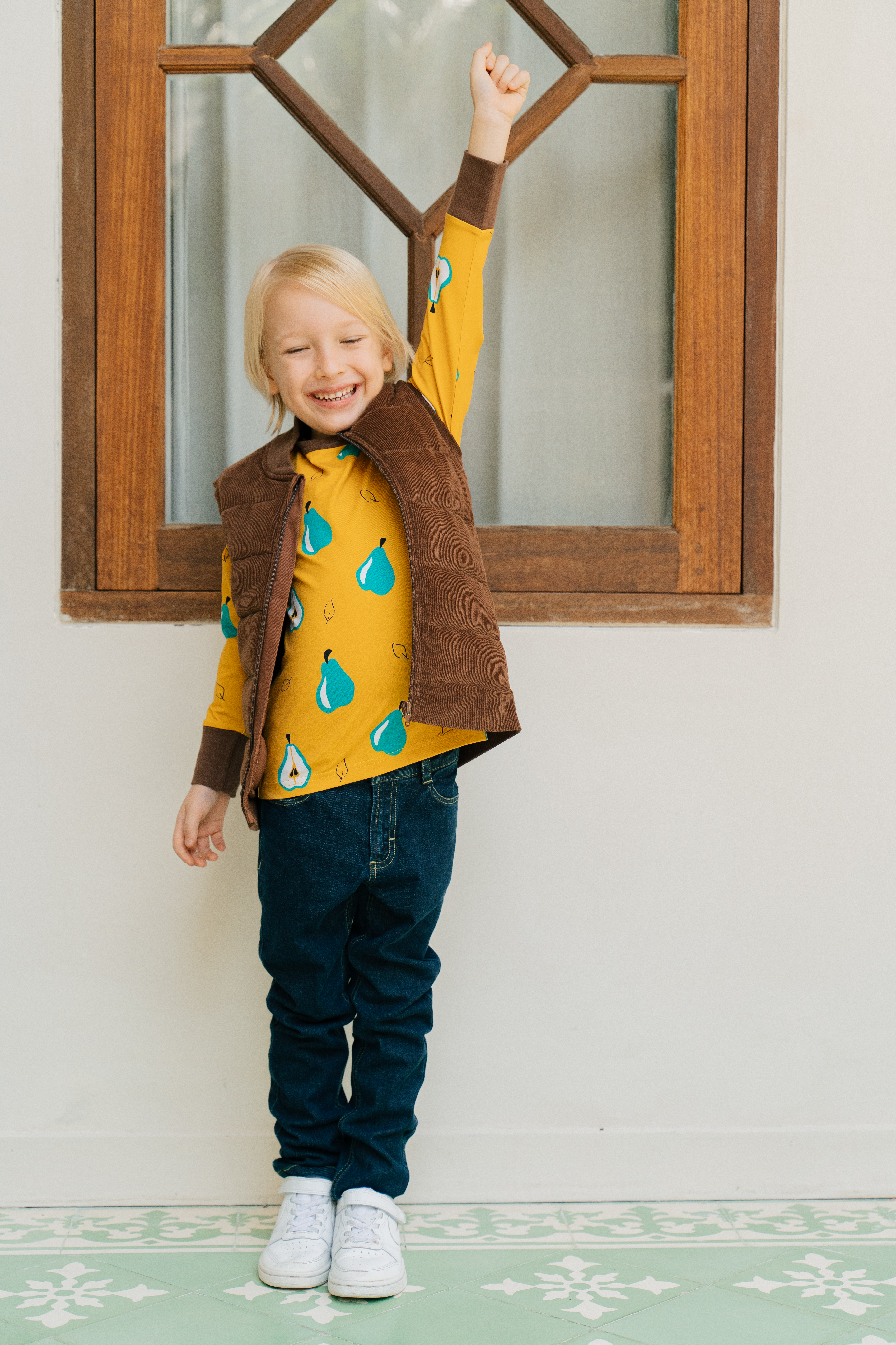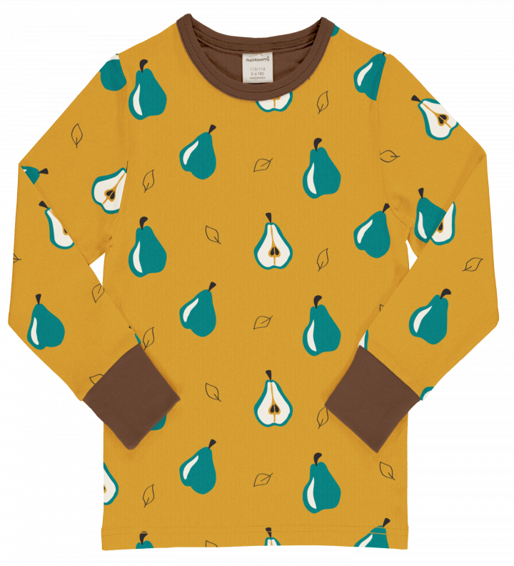 Fröhlich buntes Kinderoberteil in Gelb aus weicher Baumwolle (Bio kbA) mit einem herbstlichem Birnen-Print. Die in Braun abgesetzten Bündchen machen den Look perfekt und bieten zudem eine praktische Mitwachsfunktion.