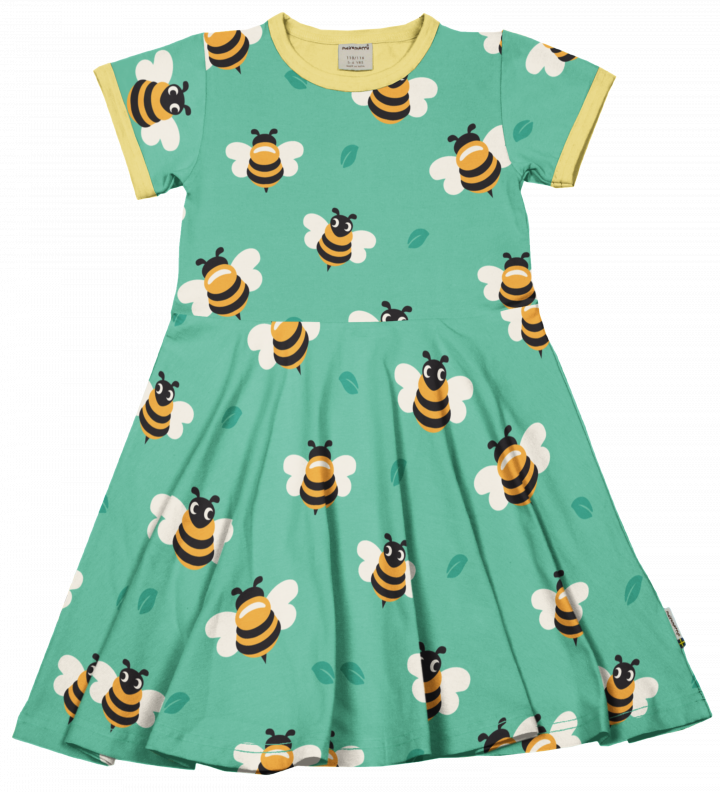 Wunderschönes, Drehkleid in Grün mit fröhlichem Bienen-Motiv. Das süße Kurzarmkleid verbreitet auch an Regentagen gute Laune.