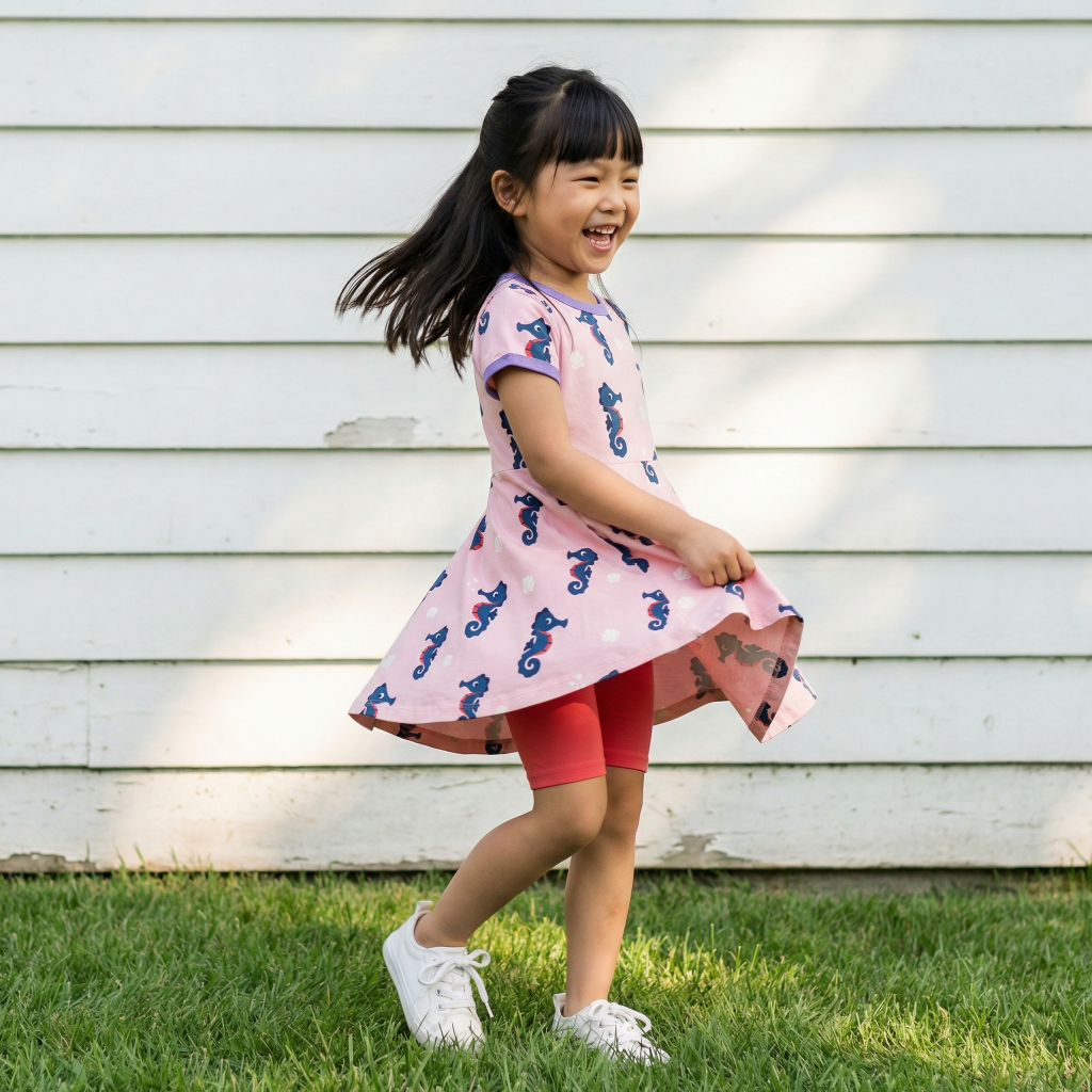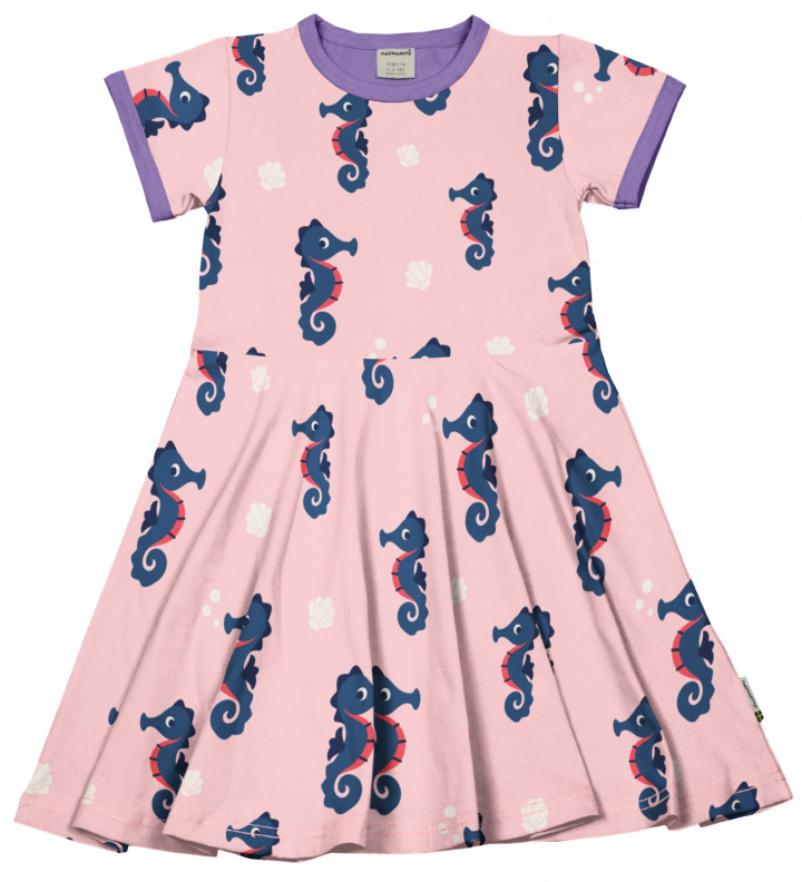 Wunderschönes, Drehkleid in Lila mit fröhlichem Seepferdchen-Motiv.Das süße Kurzarmkleid verbreitet auch an Regentagen gute Laune.