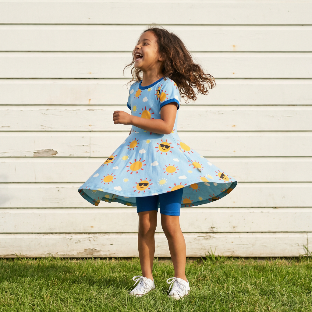 Wunderschönes, Drehkleid in hellblau mit fröhlichem Sonne-Wolke-Motiv.Das süße Kurzarmkleid verbreitet auch an Regentagen gute Laune.