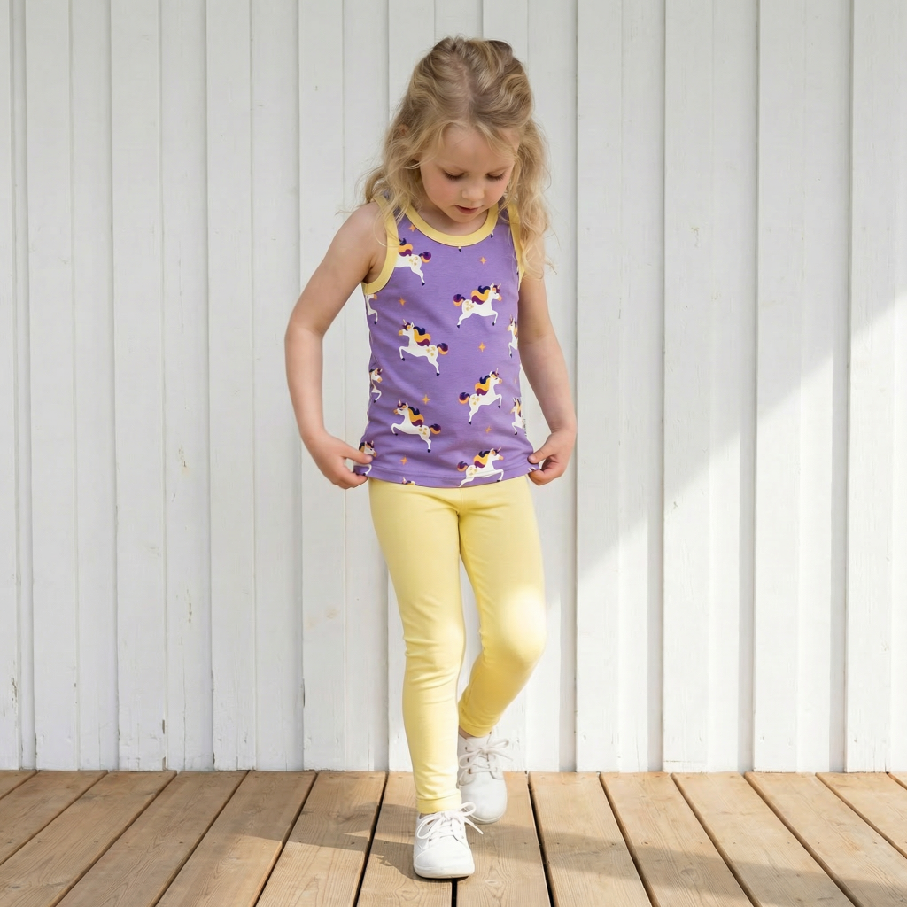 Bequeme Kinderleggings in Gelb. Die Leggings ist aus nachhaltiger Bio-Baumwolle und passt perfekt zu einem Kleid oder einem Shirt.