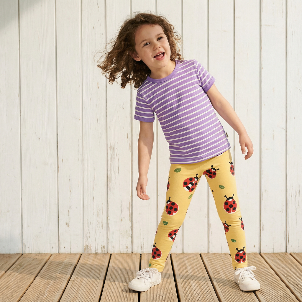 Bequeme Kinderleggings mit fröhlichem Marienkäfer-Aufdruck. Die Leggings ist aus nachhaltiger Bio-Baumwolle und passt perfekt zu einem Kleid oder einem Shirt.