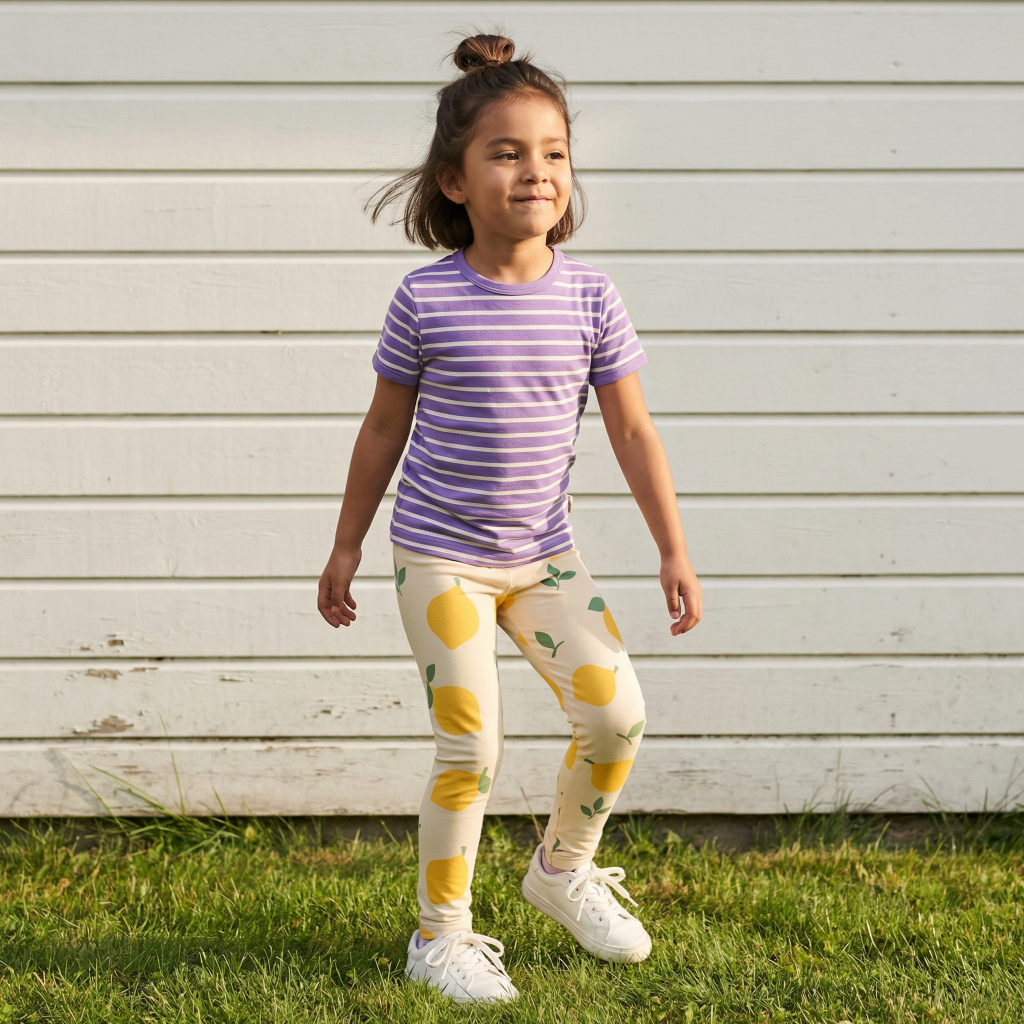 Bequeme Kinderleggings mit fröhlichem Zitronen-Aufdruck. Die Leggings ist aus nachhaltiger Bio-Baumwolle und passt perfekt zu einem Kleid oder einem Shirt.