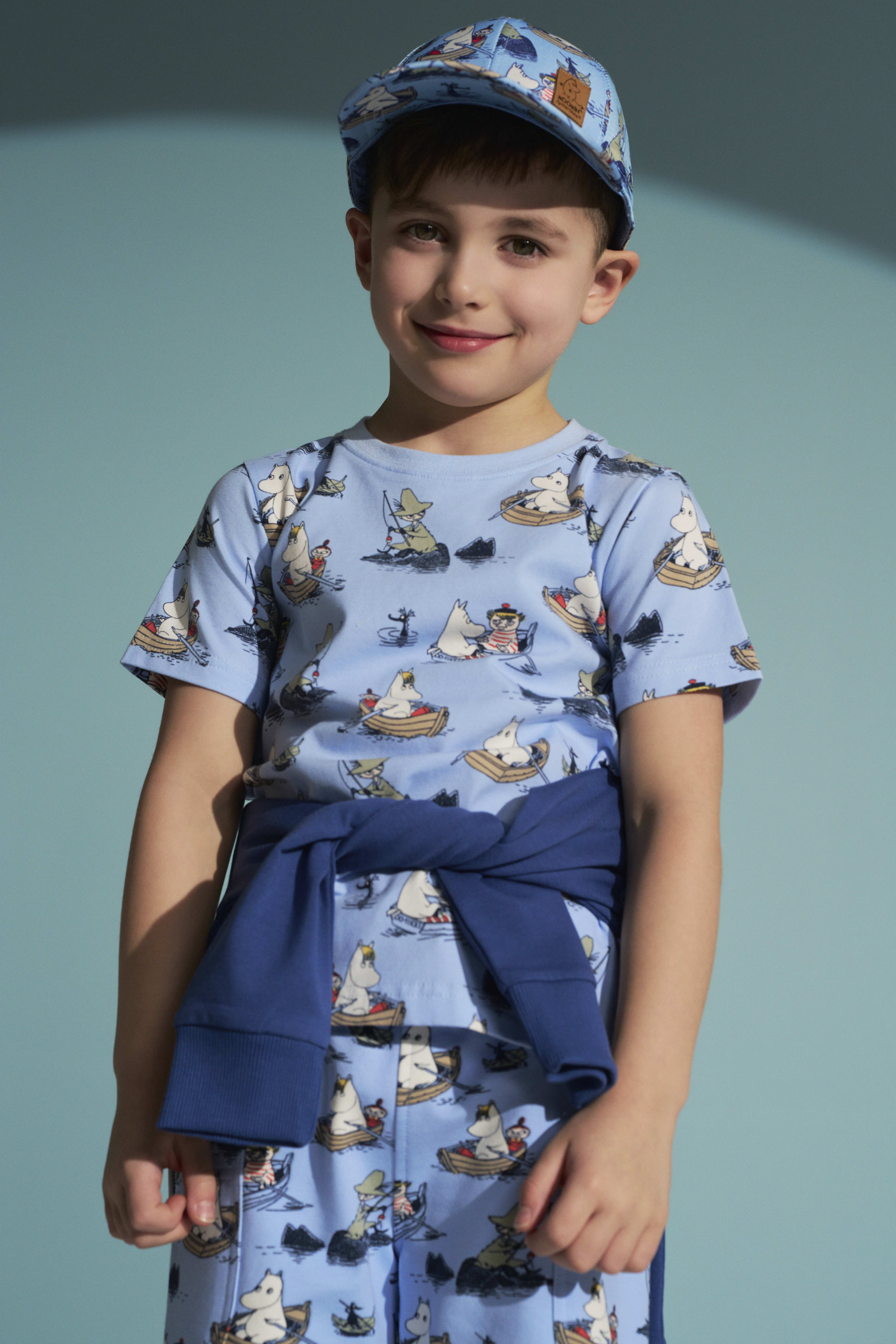 Das Shirt zeigt einen lustigen Aufdruck von Mumintroll und seinen Freunden beim Bootsausflug.