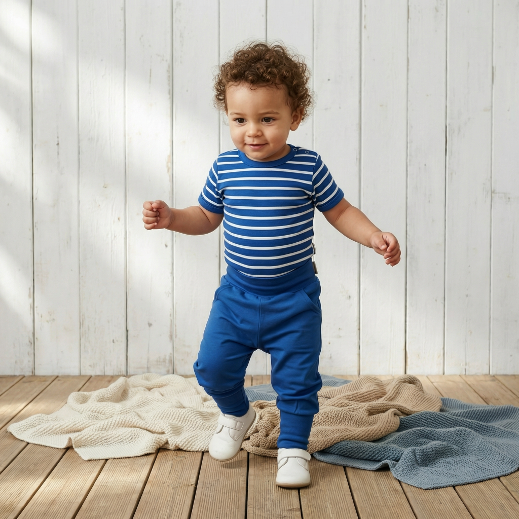 Klassische Babyhose aus weicher Baumwolle (Bio, kbA) in Blau. Die bequeme Hose sitzt perfekt, da sie dank extra langem Bauch- und Beinbündchen mitwachsen kann.