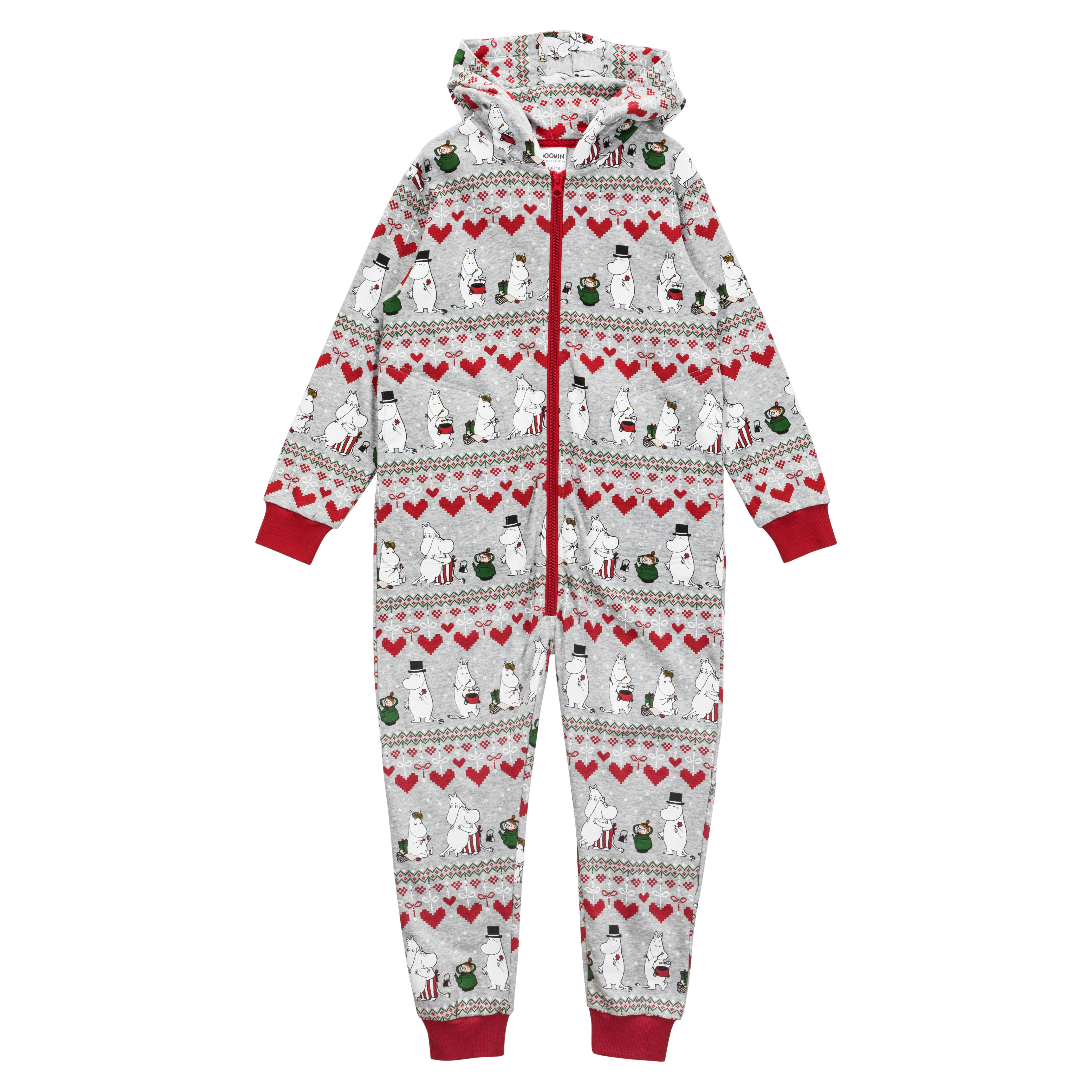 Der graumelierte Langarm-Overall für Kinder hat eine Kapuze, lange Ärmel und einen Reißverschluss. Der gemütliche Einteiler ist mit einem festlichen Mumin-Winterherz-Print versehen.