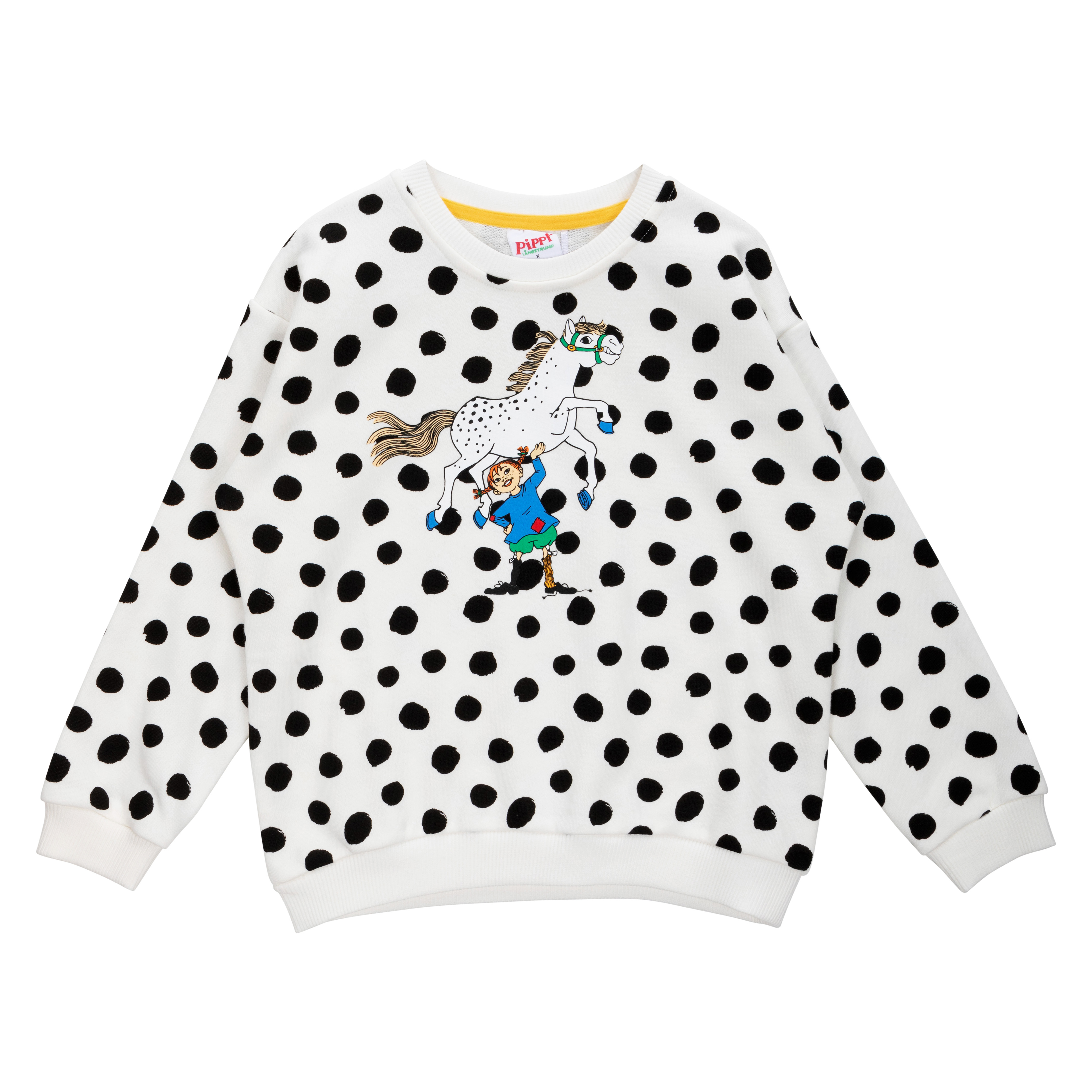 Der bqueme Pullover mit Pippi Langstrumpf Motiv hat einen lockeren, stylischen Schnitt. Ein Pullover für Fans vom Kleinen Onkel, dem Pferd von Pippi Langstrumpf. Schwarze Tupfen auf weiß, dass kann nur der Kleine Onkel sein.