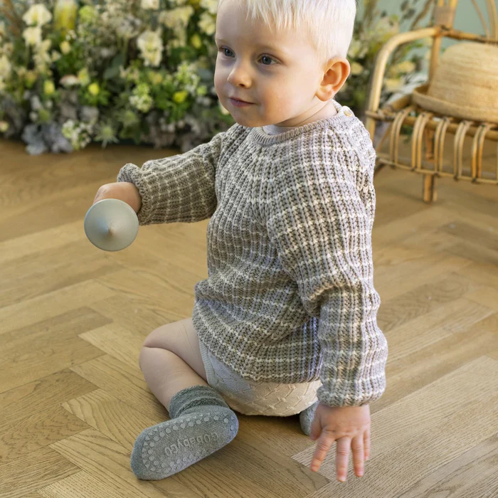Die rutschfesten GoBabyGo Socken aus Bio-Frottee sind für Babys und Kleinkinder konzipiert, die gerne krabbeln, laufen und rennen, ohne auszurutschen. Diese Socken haben Gummipolster unter den Füßen und auf den Zehen, die ein Ausrutschen auf glatten Oberflächen verhindern. Die Socken halten die Füße deines Kindes warm und sicher, eignen sich daher perfekt als Hausschuhe für die Kindertagesstätte und bieten eine sicherere Alternative zu Schuhen mit harten Sohlen. Harte Sohlen können die natürliche Entwicklung kleiner Füße hemmen, weshalb wir unsere rutschfesten Socken empfehlen. Sie ermöglichen die richtige Entwicklung neugieriger kleiner Füße und sorgen gleichzeitig für Sicherheit und Komfort.