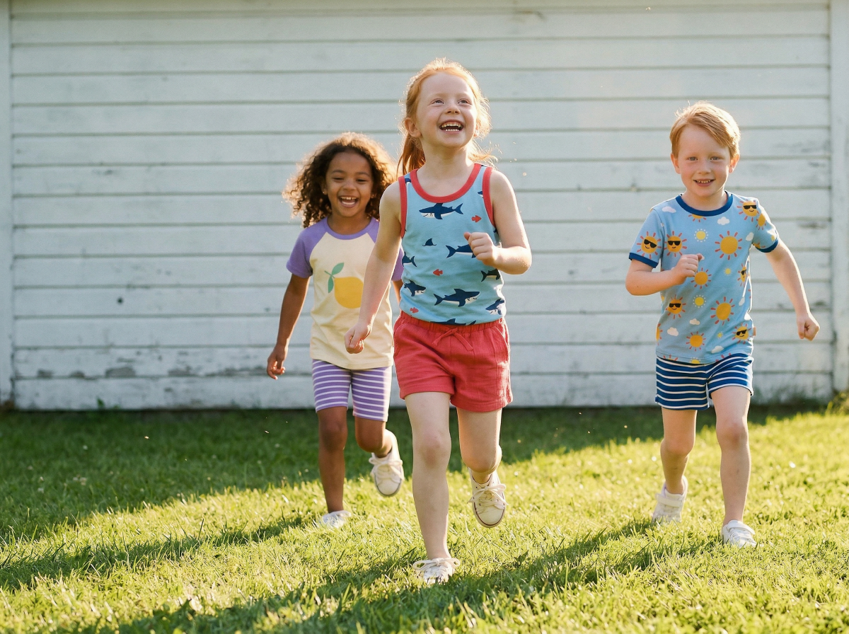 Fröhlich buntes T-Shirt für Kinder. Blaufarbenes Sommerorberteil aus weicher Baumwolle (Bio... mehr