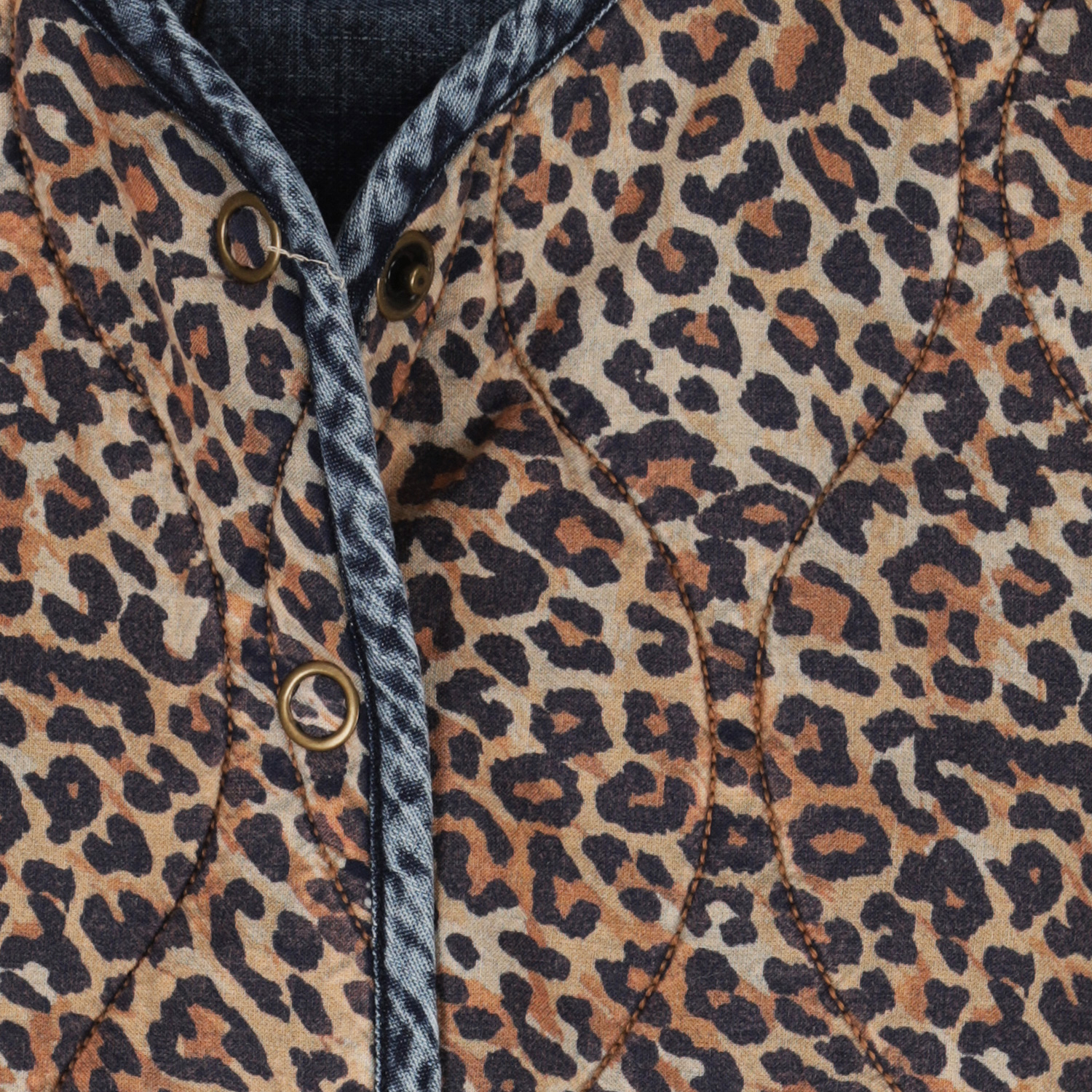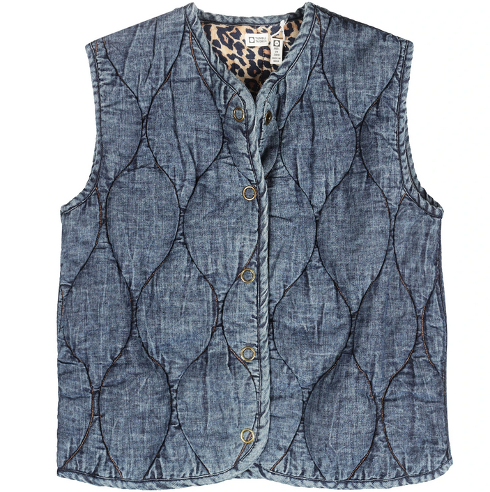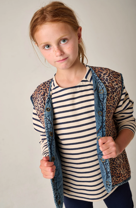 Die Weste ist wendbar, und passt daher zu jedem Outfit. Eine Seite ist schlicht im Denim-Look, die andere Seite ist verspielt mit Leo-Print.