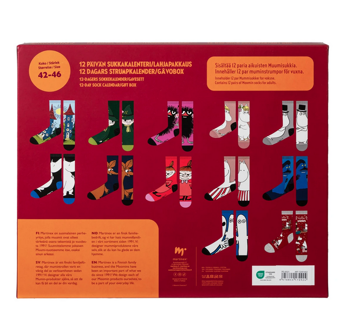Dieser Mumin-Socken-Adventskalender ist die perfekte Wahl für Mumin-Freunde und kuschelige Geschenke! Der Mumin-Socken-Adventskalender hat 12 Türchen, hinter denen sich jeweils ein Paar Socken befindet. Jedes Paar Socken hat einen anderen Stil und eine andere Farbe, und das letzte Türchen enthält ein burgunderfarbenes Paar Weihnachtssocken. Die Mumin-Socken sind aus hochwertiger Baumwolle gefertigt.