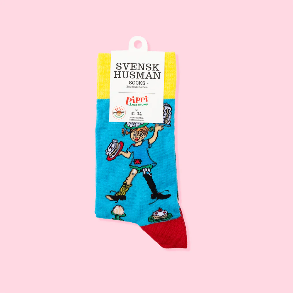Wir nehmen dich mit in die kunterbunte Welt von Pippi Langstrumpf mit diesen fröhlichen Kindersocken aus Schweden.