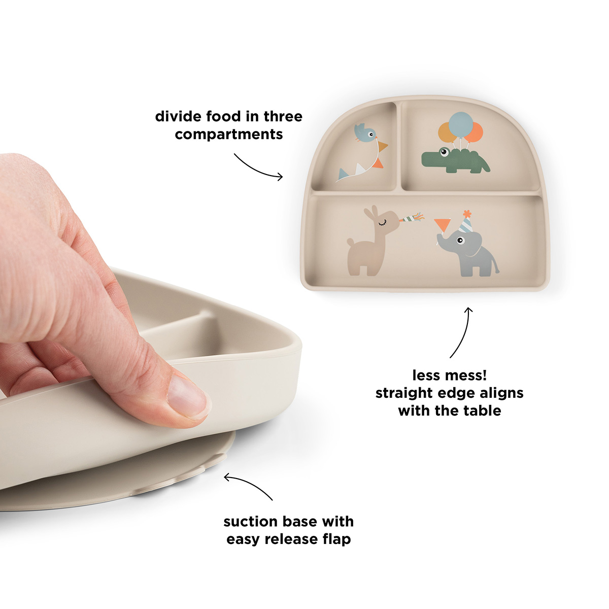 Wenn kleine Essensanfänger ihr Gedeck gerne mal vom Tisch fegen sind die niedlichen Silikonteller genau das Richtige. Absoluter Clou ist nämlich der Saugnapf, mit dem sich der Teller auf dem Hochstuhl oder dem Tisch fixieren lässt.