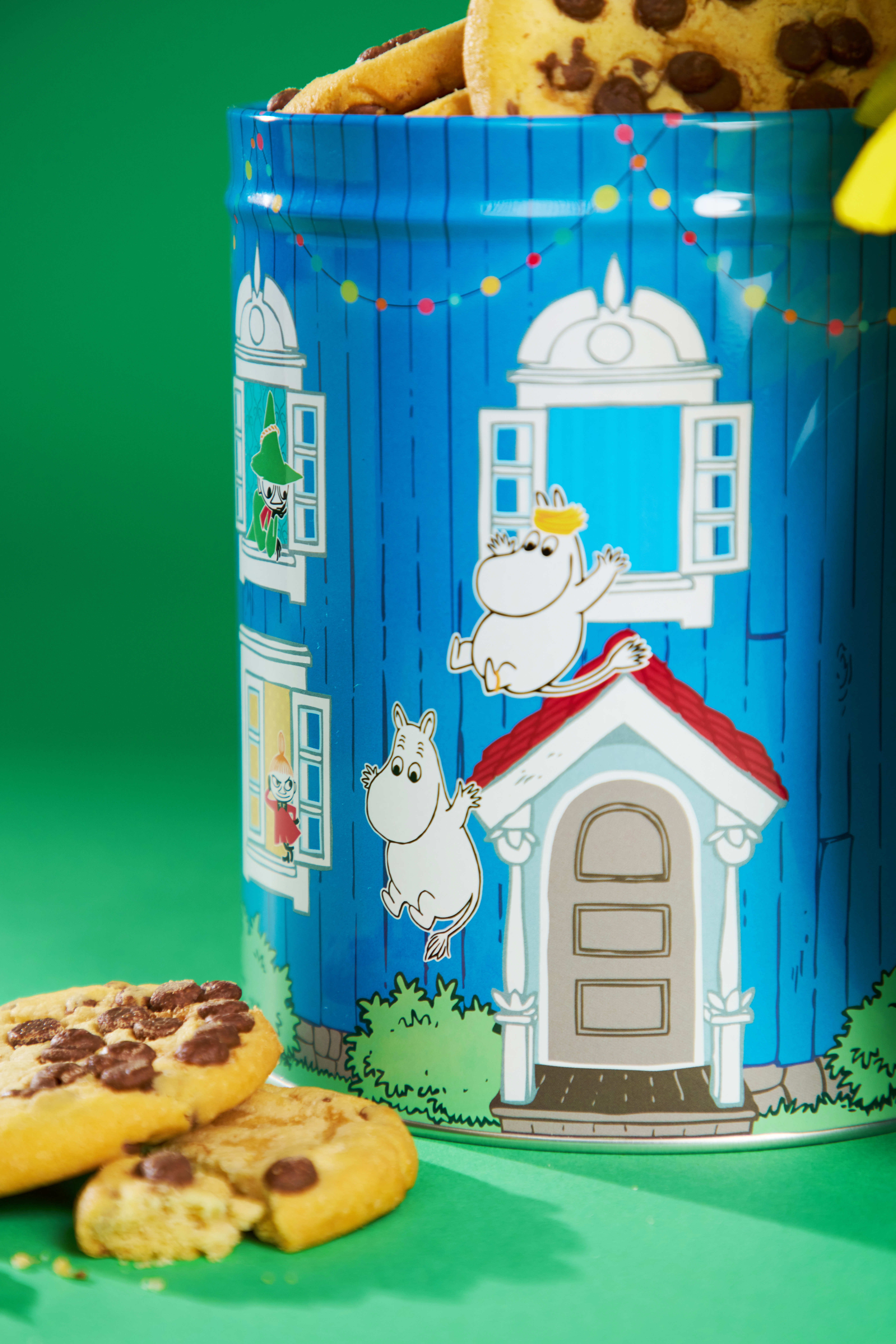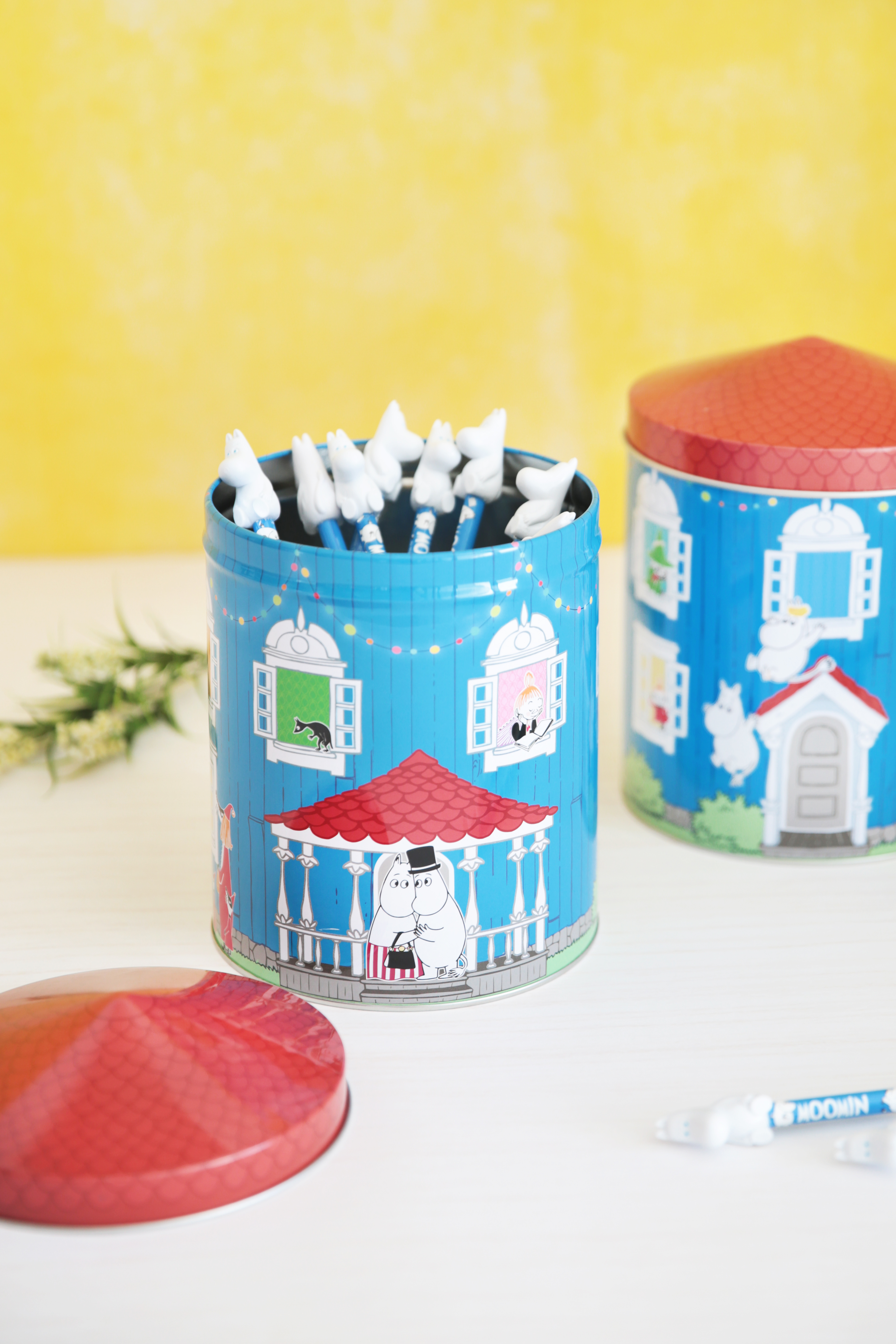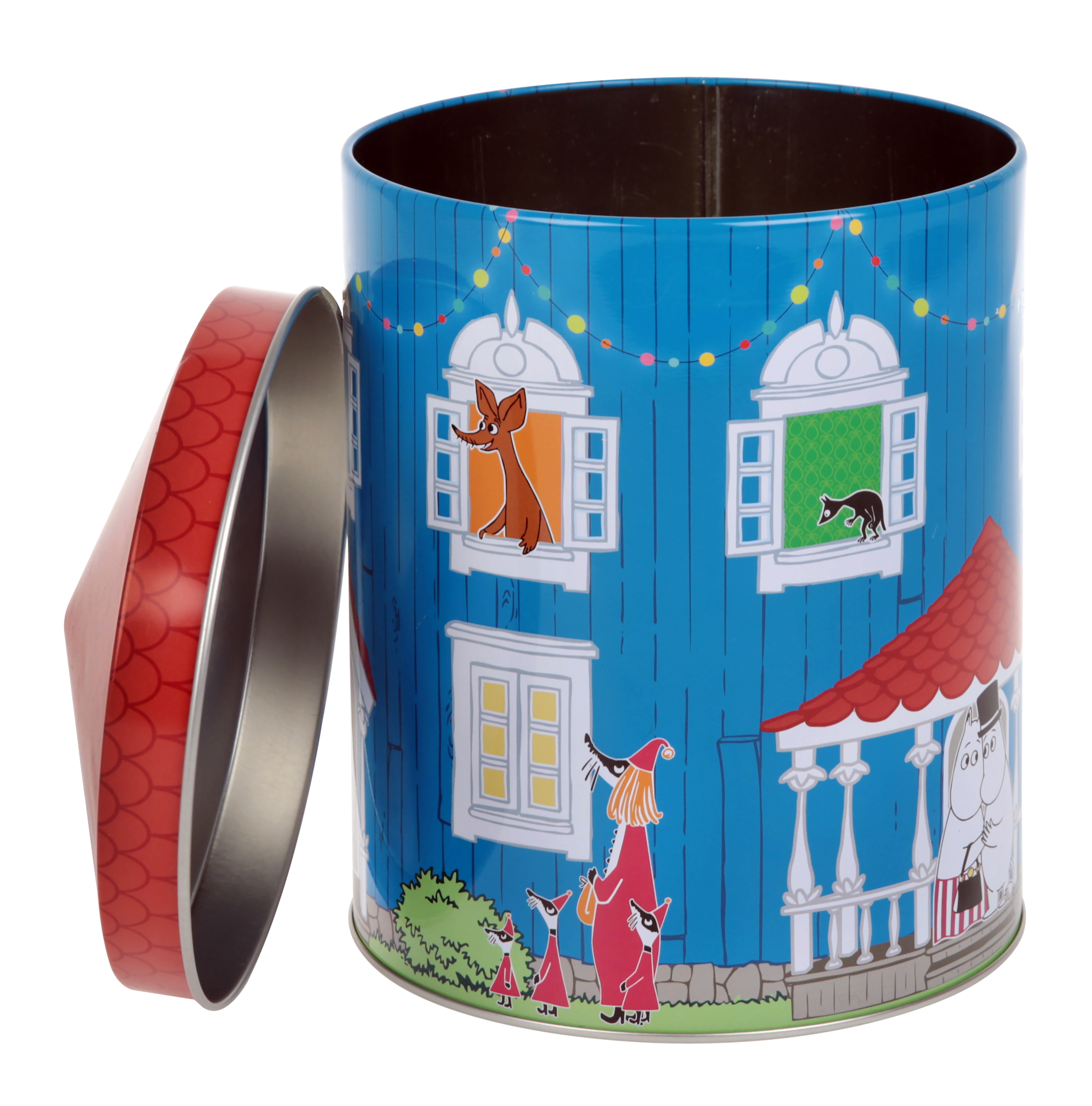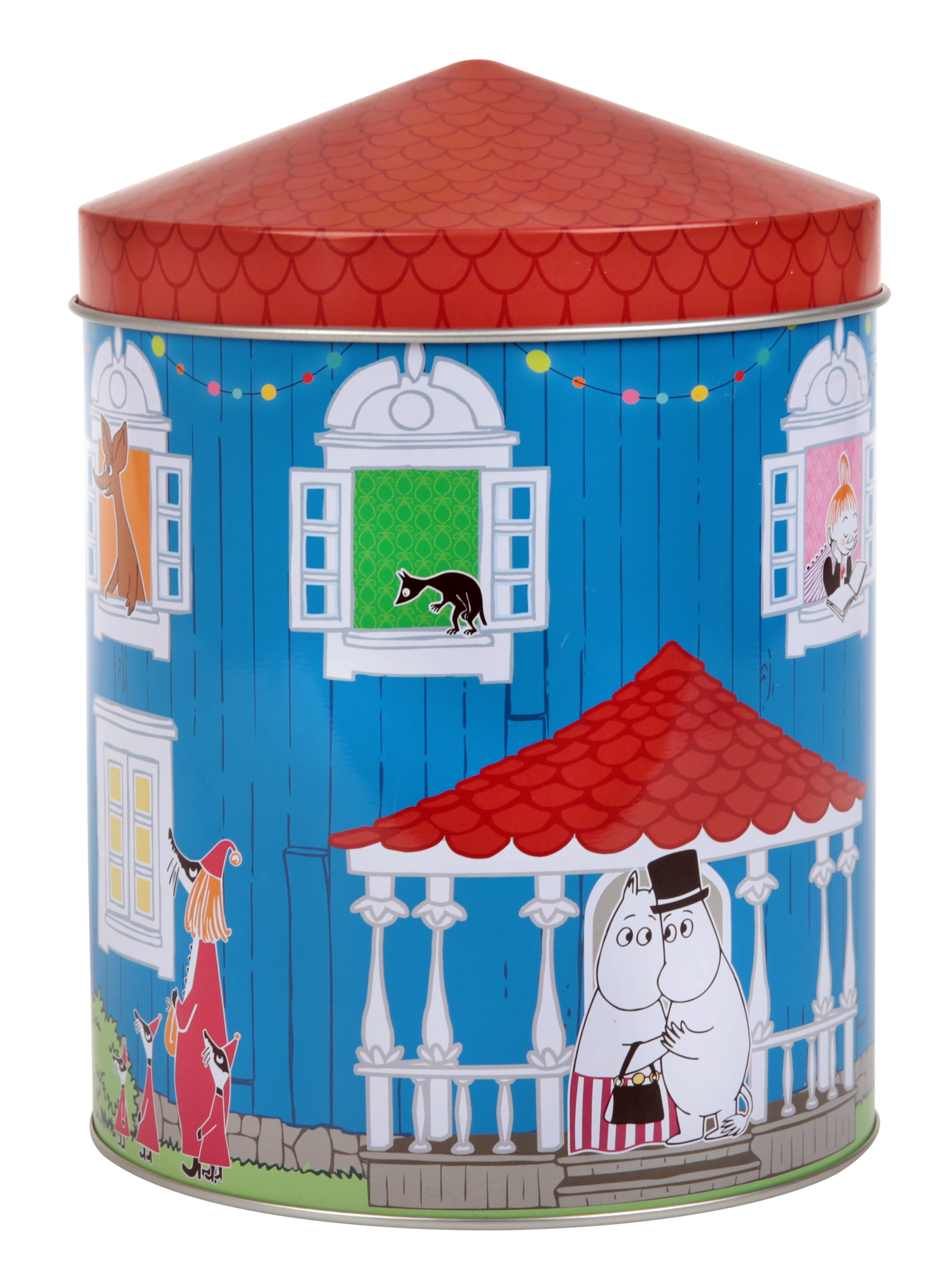 Eine runde Dose in Form und Farbe des Muminhauses. Die Illustration zeigt außerdem einige bekannte Muminfiguren. Kekse, Stifte, Süßigkeiten, Bastelmaterialien und Ähnliches lassen sich darin auf lustige Muminart aufbewahren!