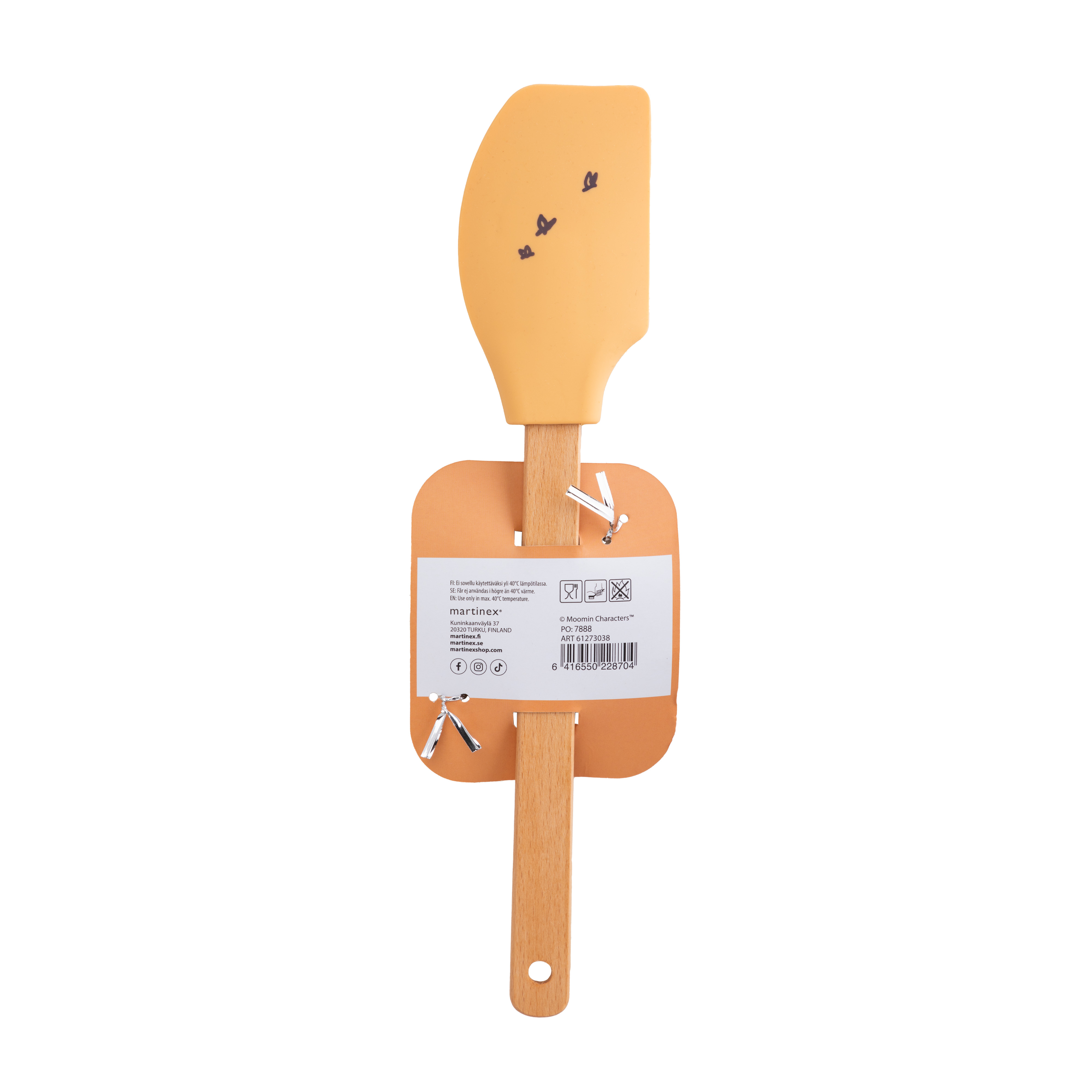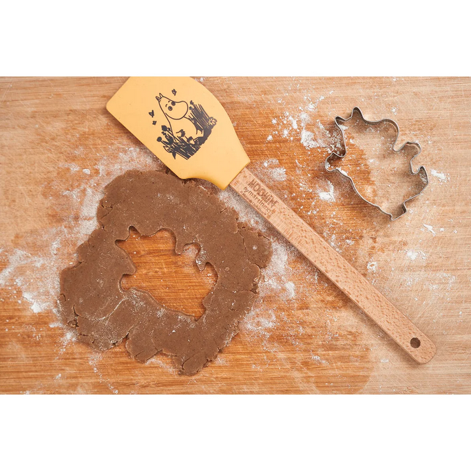 Das Set beinhaltet einen Teigscharber und einen kleinen Ausstecher. Der Silikonspachtel zerkratzt weder Töpfe noch Pfannen, und der flexible Silikonkopf ist ideal zum Teigkneten oder Verstreichen von Zuckerguss. Der Holzgriff hat eine praktische Aufbewahrungsöse. Der Ausstecher ist in Mumin-Form und hat verstärkte, weiße Ränder, die die Handfläche beim Ausstechen des Teigs schützen.