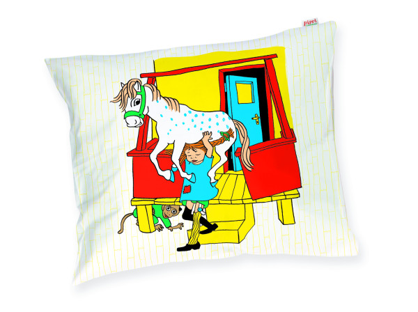 Der bunte Kissenbezug zeigt Pippi Langstrumpf mit ihrem Pferd vor ihrem Haus, der Villa Villekulla. Der Kissenbezug hat eine Größe von 50 x 60 cm und kann als Bettwäsche oder als Dekokissen verwendet werden.