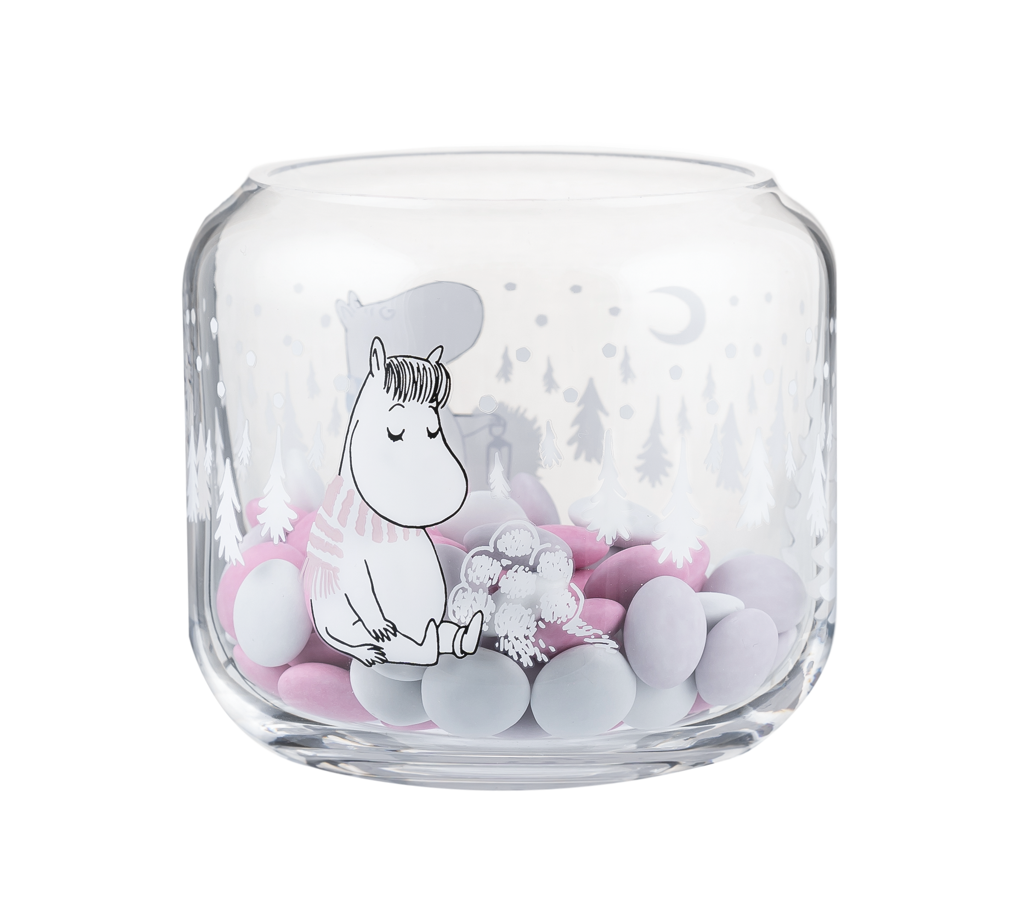 Das Schneemotiv mit unseren Lieblingen aus dem Mumintal macht dieses Teelichtglas zu einem liebevollen Geschenk für einen besonderen Menschen – oder zu einer schönen Art, sich selbst eine Freude zu machen. Du kannst natürlich auch leckere Jättegott Süßigkeiten in dem Glas aufbewahren.